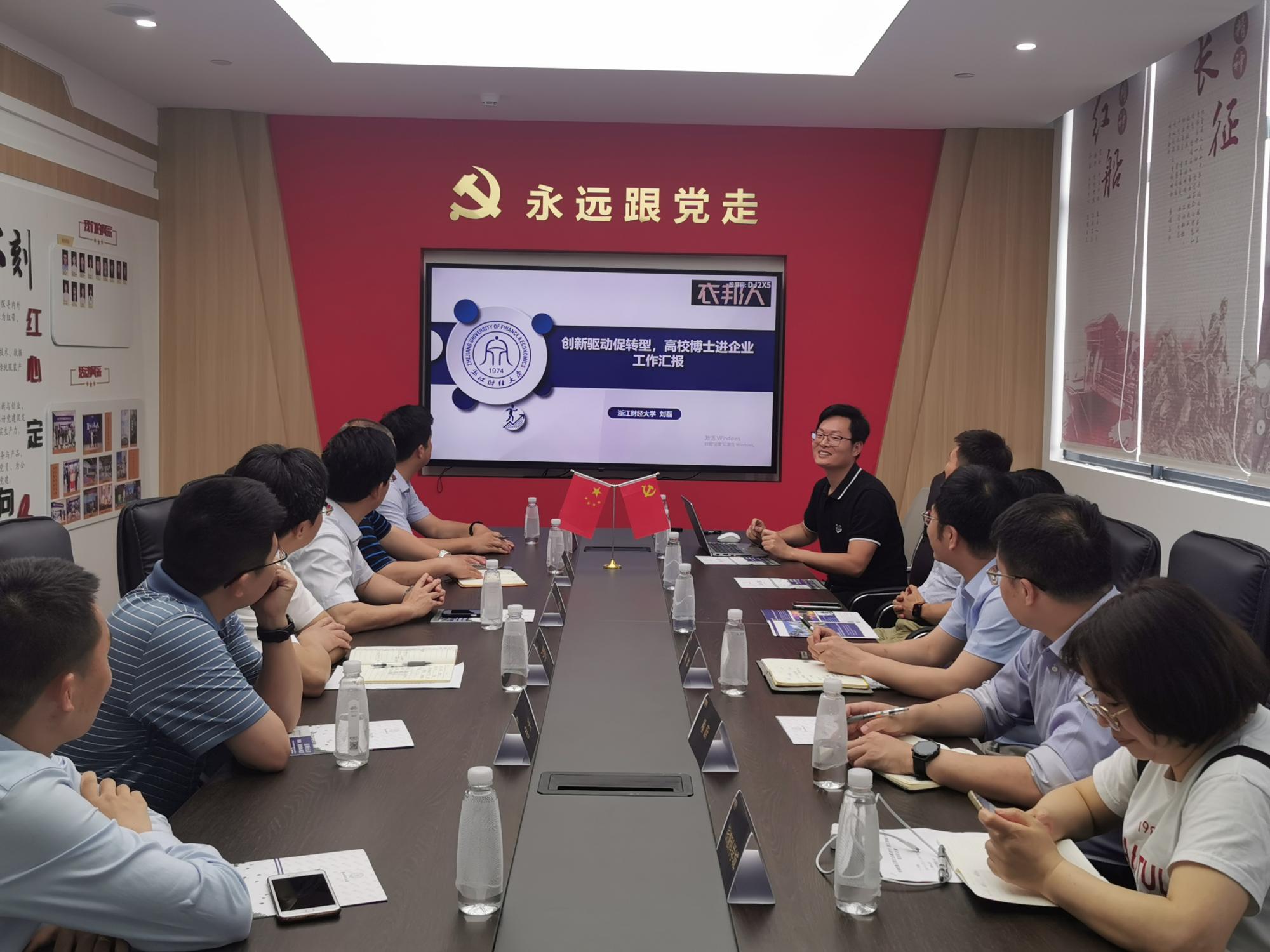 董校长一行受到杭州衣邦人科技有限公司创始人兼CEO方琴和浙江五丰冷食有限公司副总经理江雪英的热情接待。董进才介绍了学校的基本情况和毕业生情况,对杭州衣邦人科技有限公司和浙江五丰冷食有限公司对学校工作的大力支持表示感谢。董校长听取了刘磊博士挂职期间所取得的国家专利和国家工程实验室研究项目等成果汇报。希望校企业双方继续加强交流和合作,通过博士进企业、在校生进企业等项目,增进学校、学生和企业之间的了解和共识,增加实践体验,推动用人、育才精准匹配。