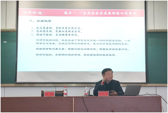 于学院楼217教室举行了学生干部能力提升讲座。本次讲座邀请了曾鹏翔老师(军事专业硕士,原舟山警备区司令员)作为主讲人,院党委副书记吴玻为主持人,讲座从能力概念、核心能力、把握趋势和把握危机四个板块入手,帮助学生全方位了解自己,找到个人能力提升的最佳路径。 首先吴玻书记隆重介绍了本次讲座的主讲人曾鹏翔老师。曾老师阅历丰富,对于个人能力的提高有很多方法和经验。曾老师表示:“能力是认识世界,改造世界的能力。虽然不同的人能力的体现方式不同,但是其根本动力相同。”只有足够的能力,才能更好体现自己的才华。
