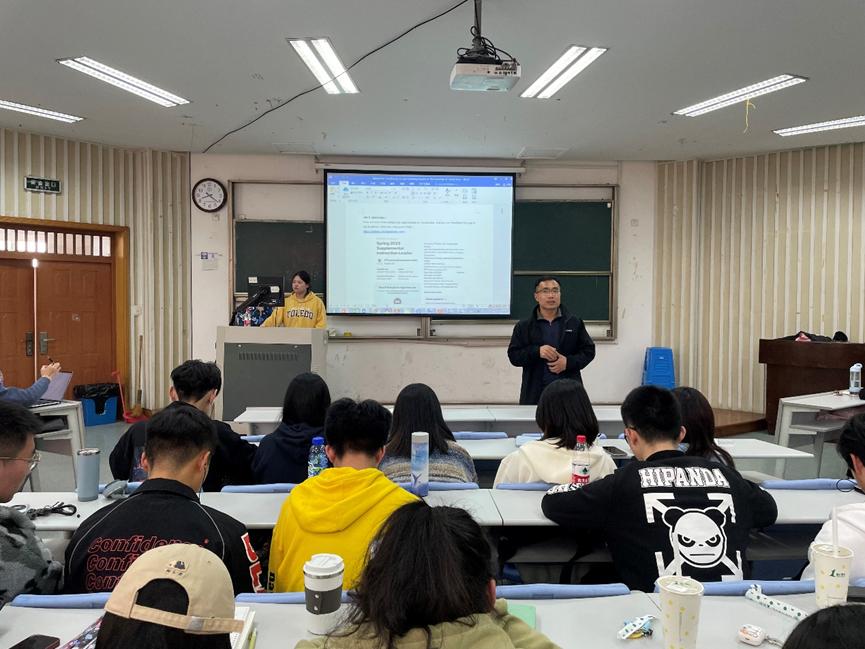 主办的托莱多大学交流项目宣讲活动在学院楼115举办。会议由项目负责人王建国老师主持,赴托莱多留学归来的大四毕业生刘可意、周舟主讲,同时,2021级、2022级中美市场营销专业的全体学生参与了此次宣讲活动。