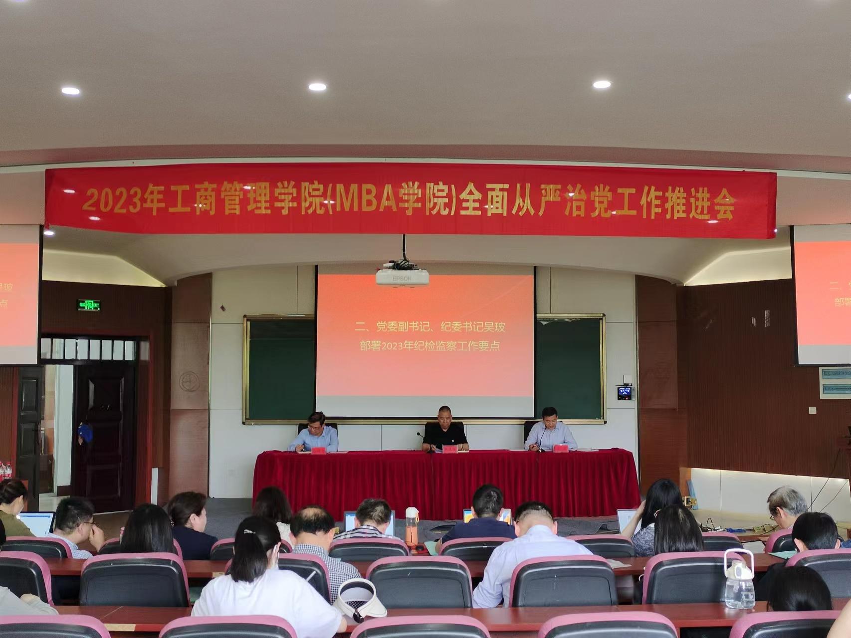 (MBA学院)党委召开2023年全面从严治党工作推进会,学院党政领导班子和全体师生党员参加了本次会议。会议由学院党委副书记、纪委书记吴玻主持。