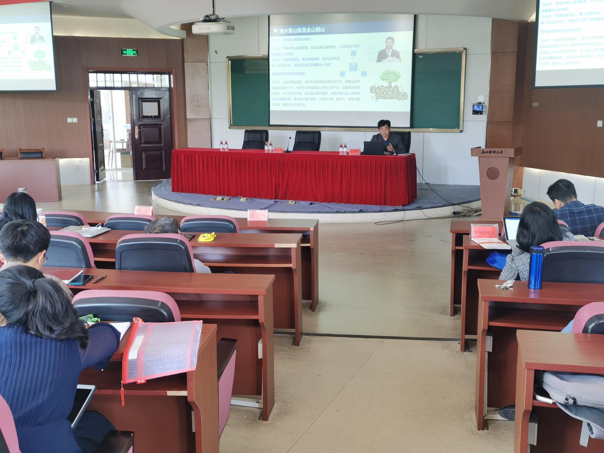 在学院楼217报告厅召开深入开展习近平新时代中国特色社会主义思想主题教育集体学习活动。学院院长王建明以“两山”理念的提出及其科学内涵为主题给大家做了学习报告。学院全体教职工党员参加学习,会议由工商番茄小说