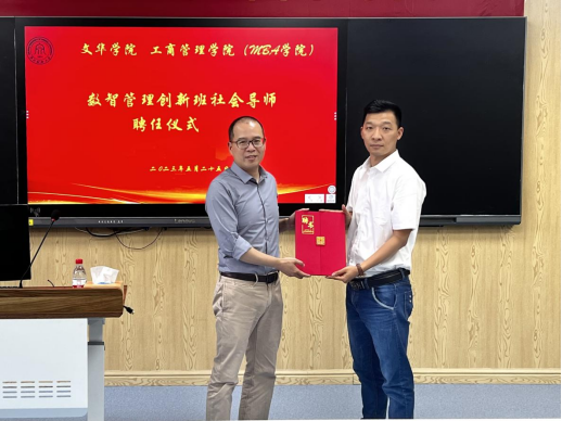本次讲座分为三个环节,第一环节为数智管理创新班社会导师聘任仪式,由方成老师为刘新老师颁发聘书。
