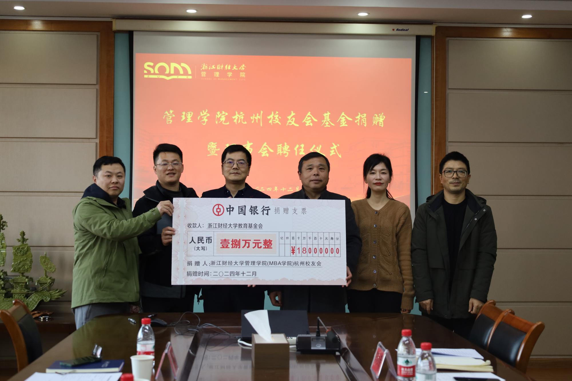 12月20日下午,学院杭州校友会基金捐赠暨理事会聘任仪式在学院楼410会议室举行。浙江泽大律师事务所合伙人、学院杭州校友会副会长兼秘书长、2001届市场营销专业校友方建江,恒逸石化股份有限公司副经理、2008届市场营销专业校友谢吕布、杭州逸滨科技有限公司李戈,学院党委书记朱力明、党委副书记陈小芳、校友与社会合作办主任胡星平等参加捐赠暨聘任仪式。