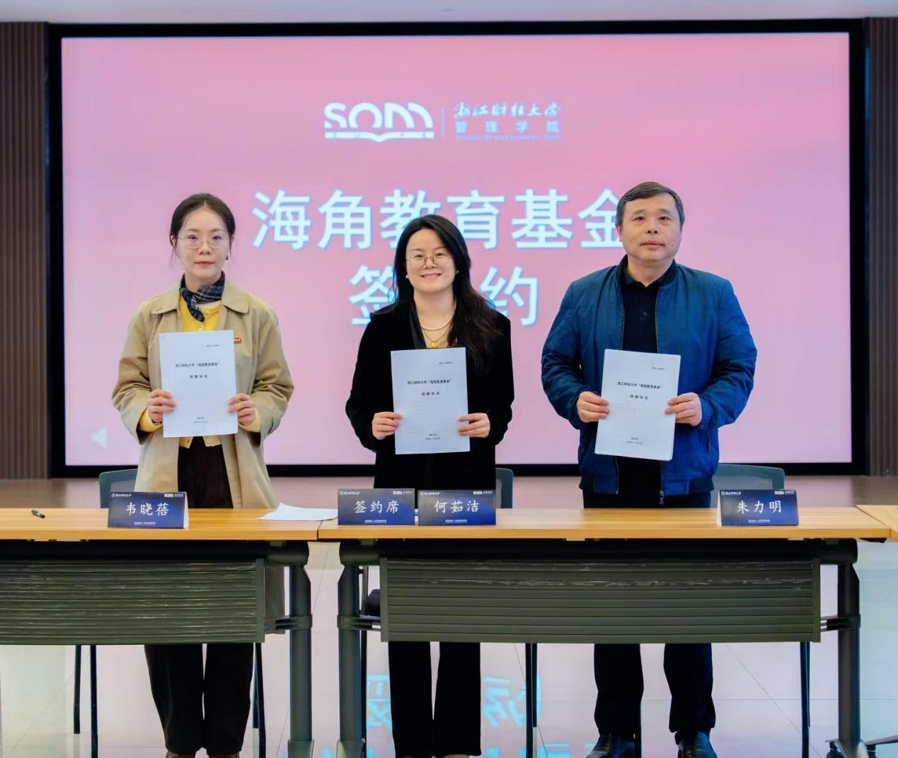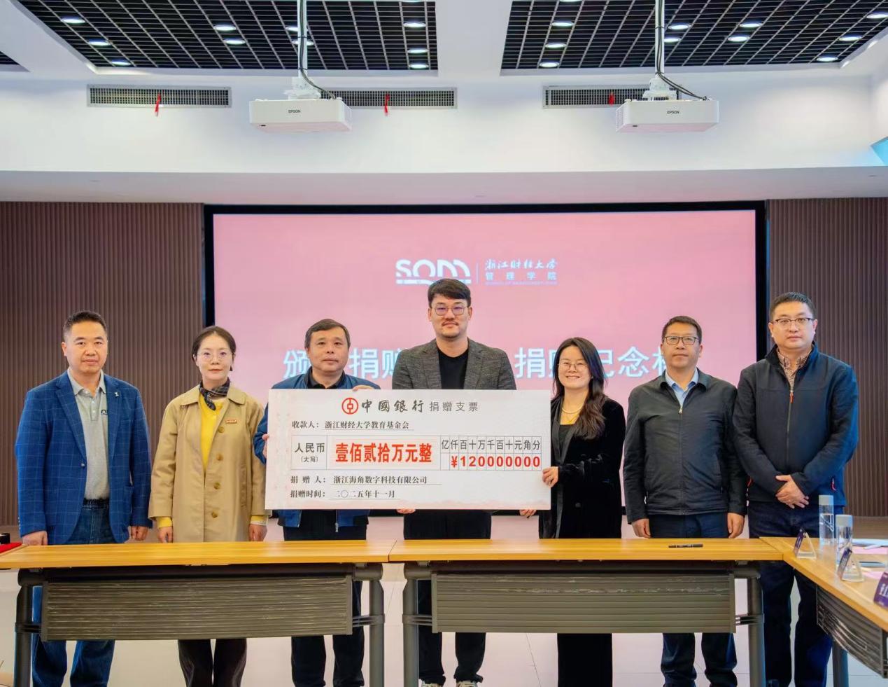 捐赠仪式上,学院党委书记朱力明与浙江海角数字科技有限公司总经理何茹洁、校教育基金会副主任韦晓蓓共同签订了捐赠协议,海角科技有限公司董事长竺俊景向朱力明交递捐赠支票。