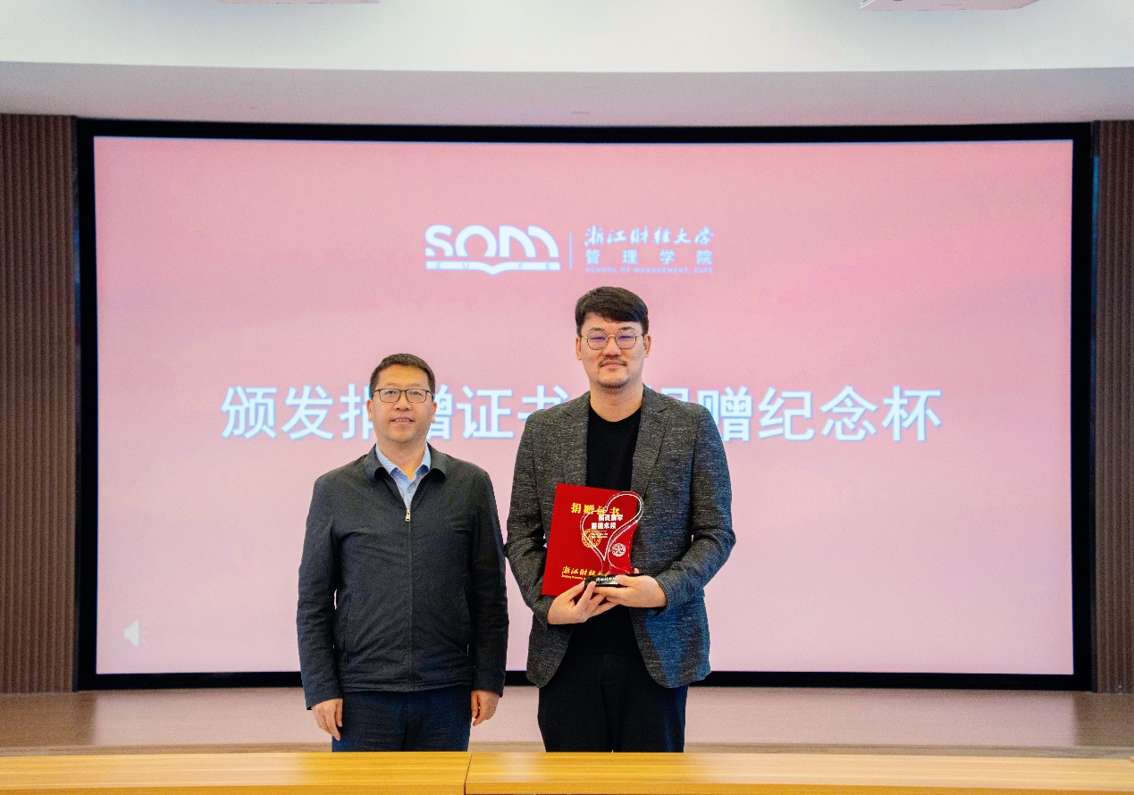 社会合作处处长杨剑勇向竺俊景董事长颁发捐赠证书、捐赠纪念杯