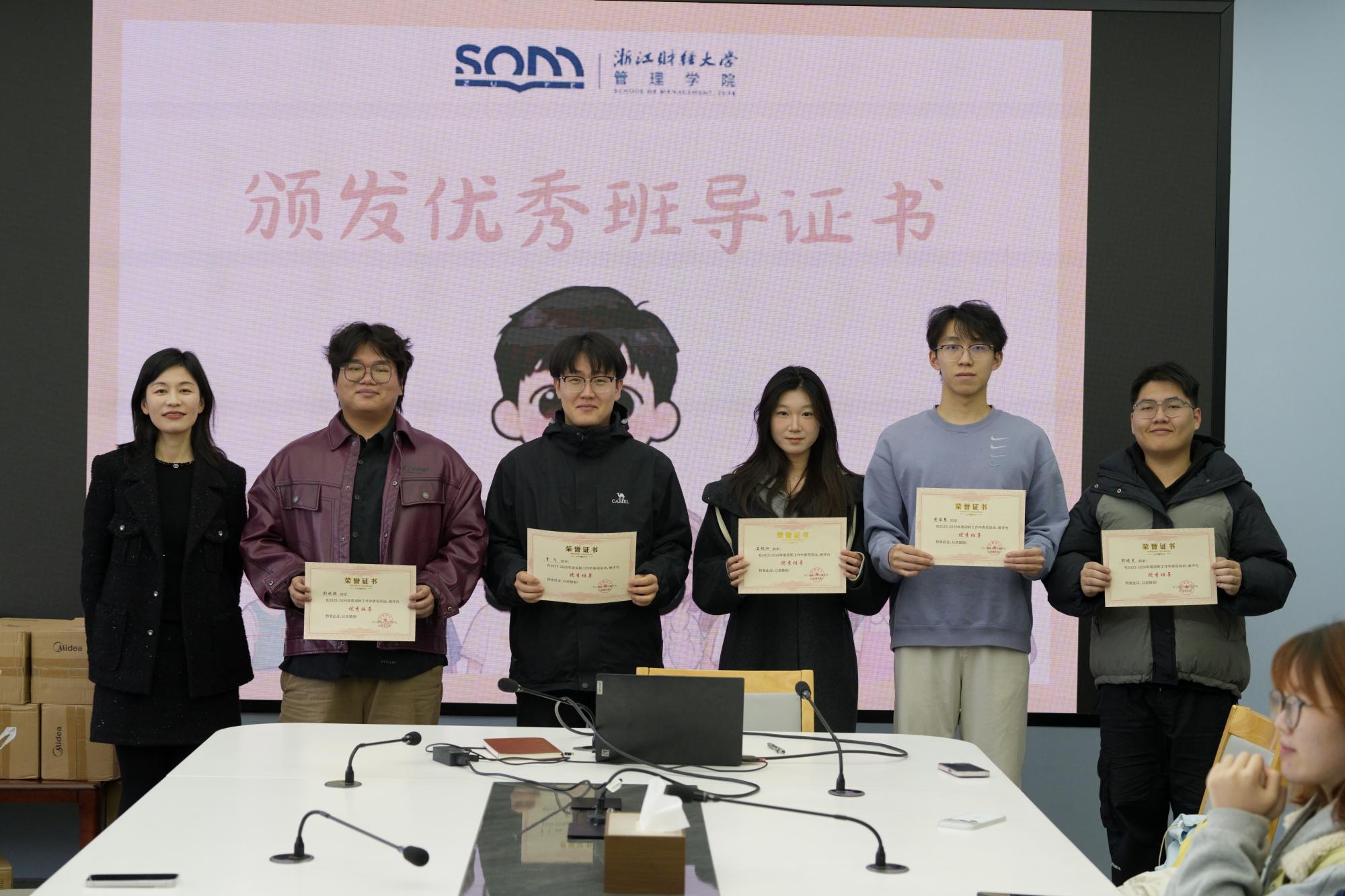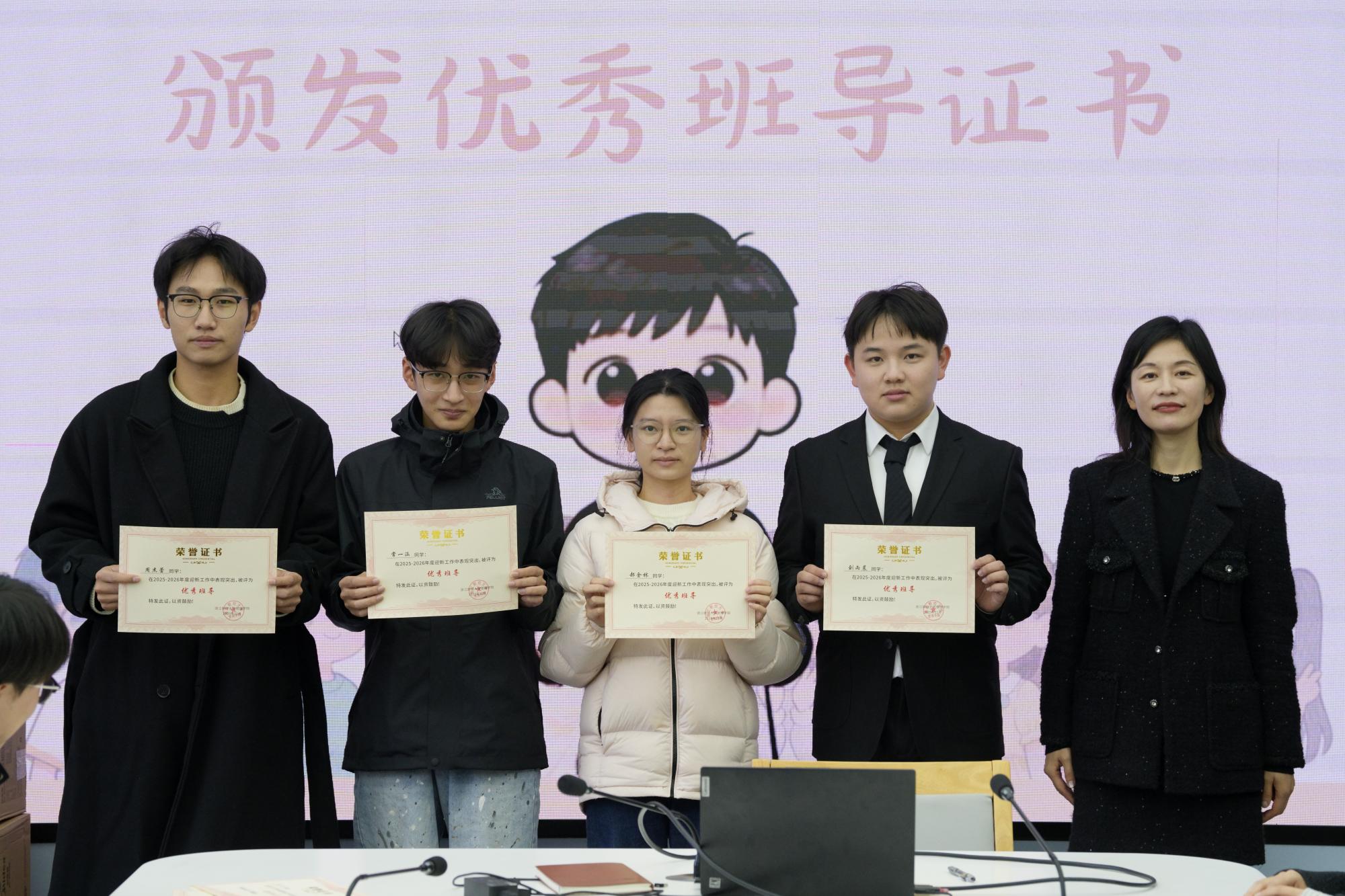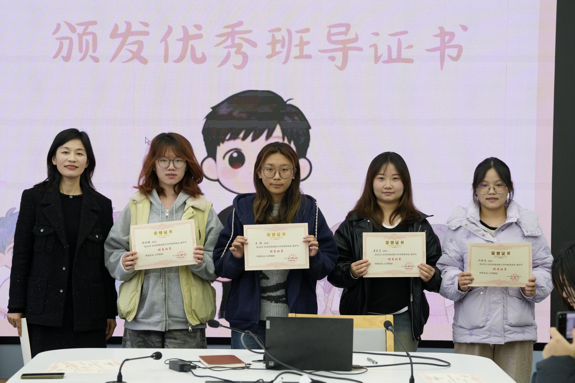 发言结束后,会议进入“荣誉时刻”,开启优秀班导证书颁发仪式。陈小芳依次为优秀班导代表颁发证书。红色证书在暖光下熠熠生辉,既承载着学院的认可,也凝聚着新生的信赖。接过证书时,班导们眼中满是珍视,台下掌声阵阵,是对他们默默付出的最好回应。