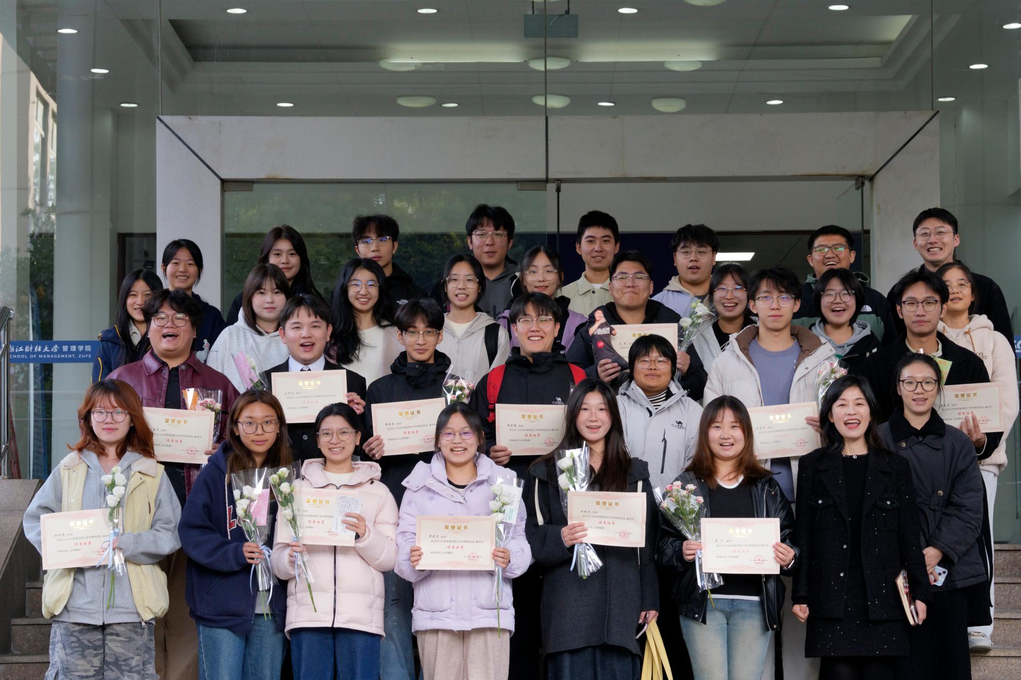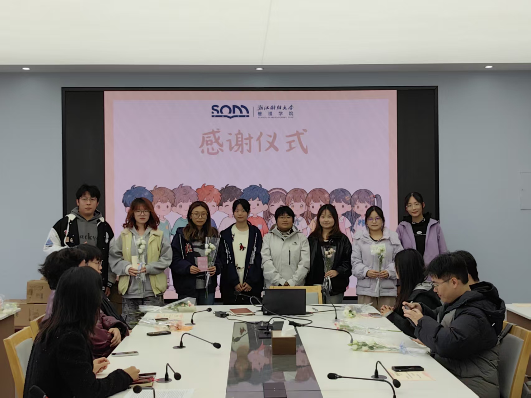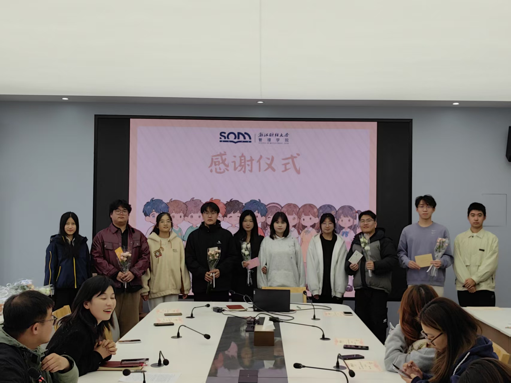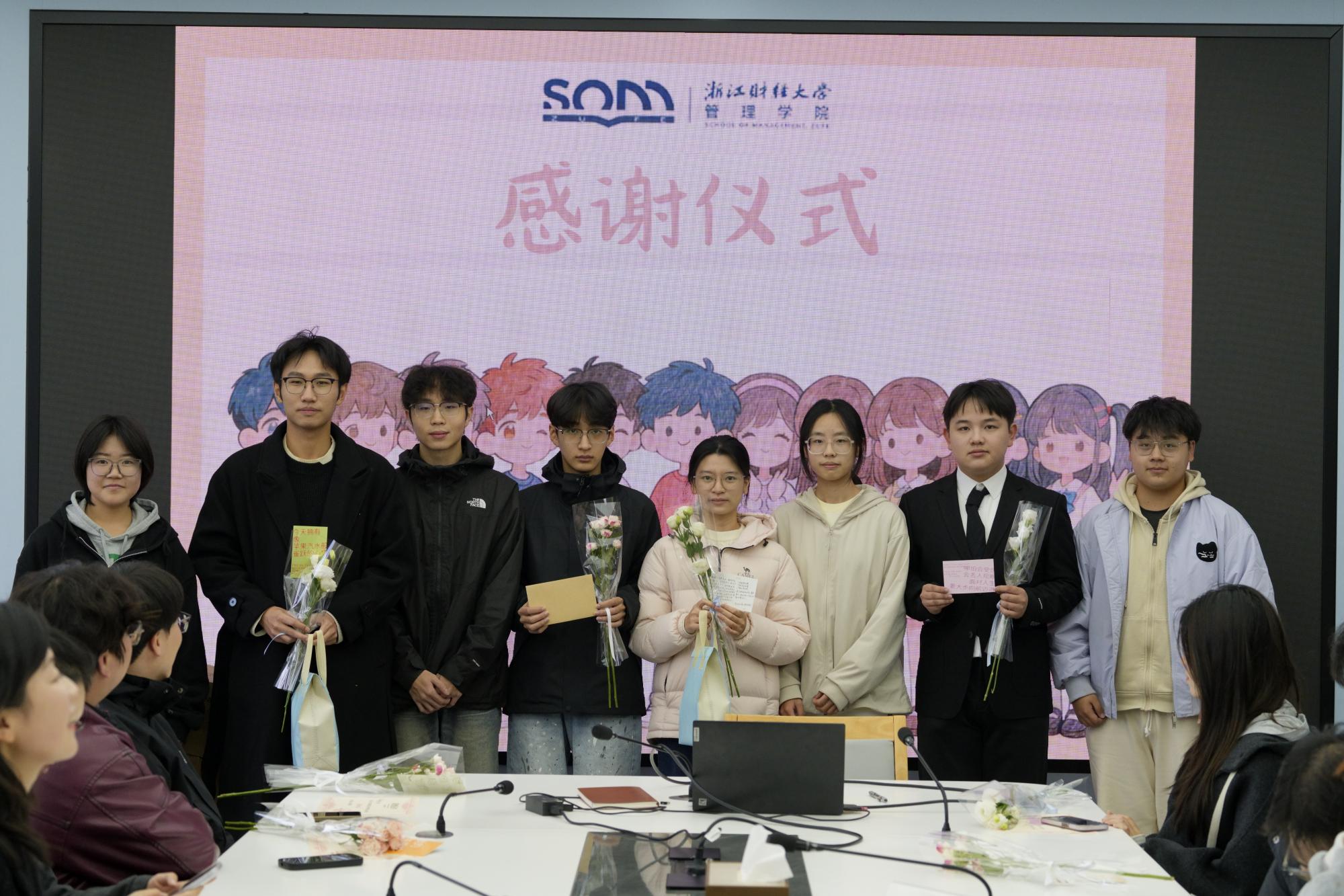 仪式最后,全体人员在学院大厅合影。领导与班导们手捧花束、贺卡,笑容真挚灿烂,快门声落,这帧师生同心的温暖画面被永久定格,为感谢会画上圆满句号。