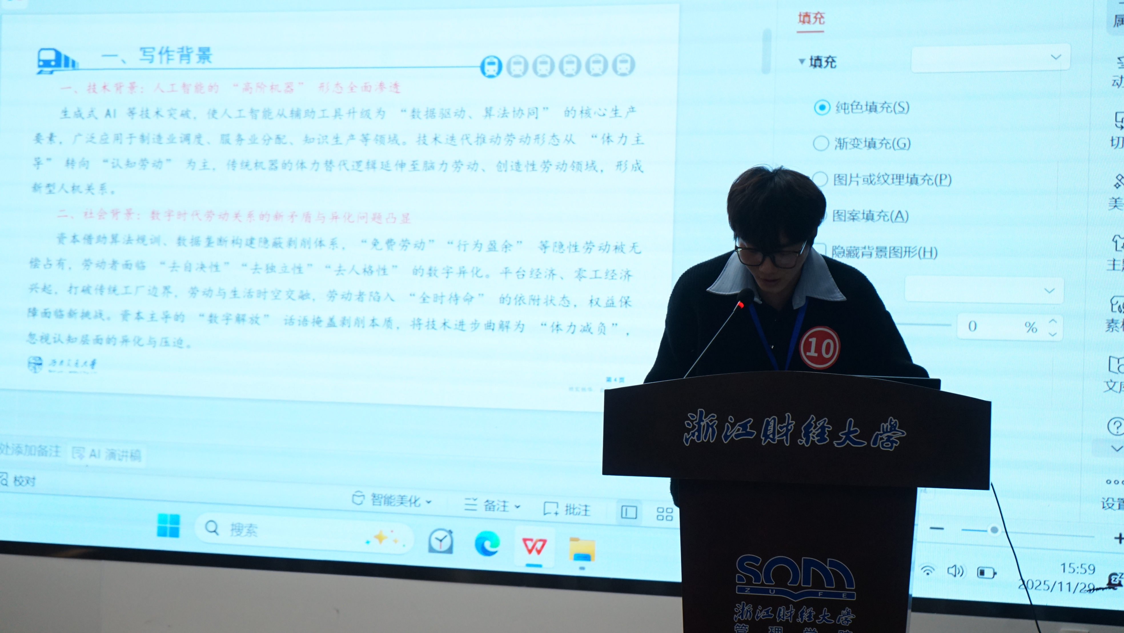 现场汇报中,10位选手围绕企业高质量发展、数字化管理转型、人工智能应用等议题展开深入阐述。评审专家从选题创新性、理论逻辑、研究方法等多维度进行点评与指导,在交流中激发思考,在互动中凝聚共识,充分体现了番茄小说