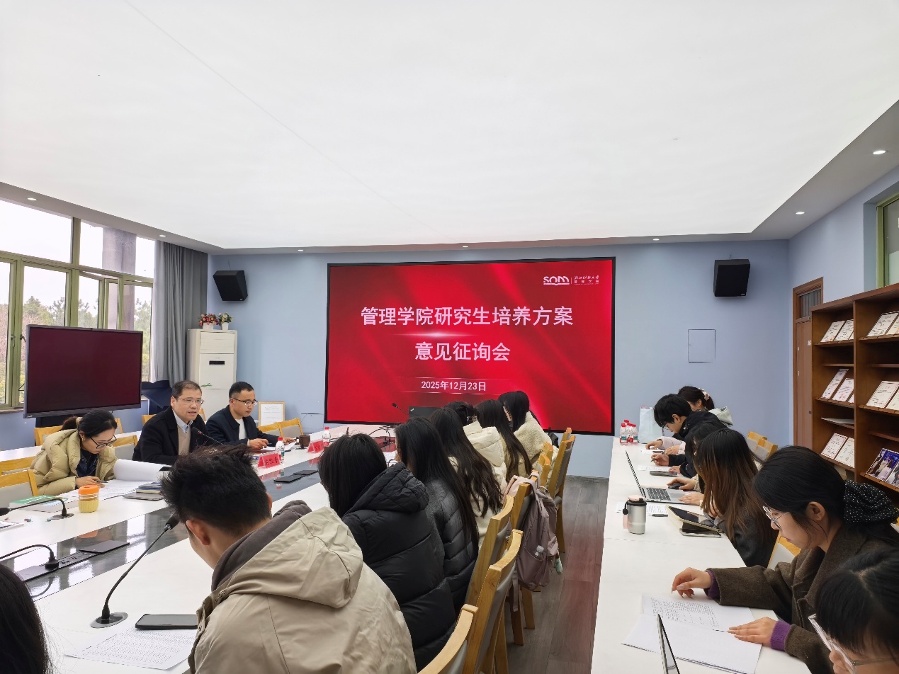 于2025年12月23日组织召开研究生培养方案意见征询会,围绕博士生、硕士生现行培养方案,广泛听取师生代表意见,旨在构建更科学、更前沿、更贴近需求的研究生培养体系。会议由学院副院长戴维奇教授主持,学术副院长王婉茹以及王建国等教师代表及各专业研究生代表共同参会。