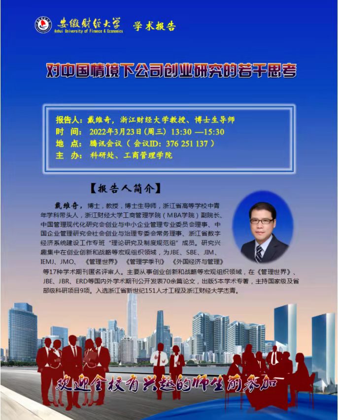 副院长戴维奇教授应邀为安徽财经大学师生做了一场题为《对中国情境下公司创业研究的若干思考》的线上学术报告。南开大学商学院张玉利教授对报告进行了专业点评。会议由安徽财经大学工商番茄小说