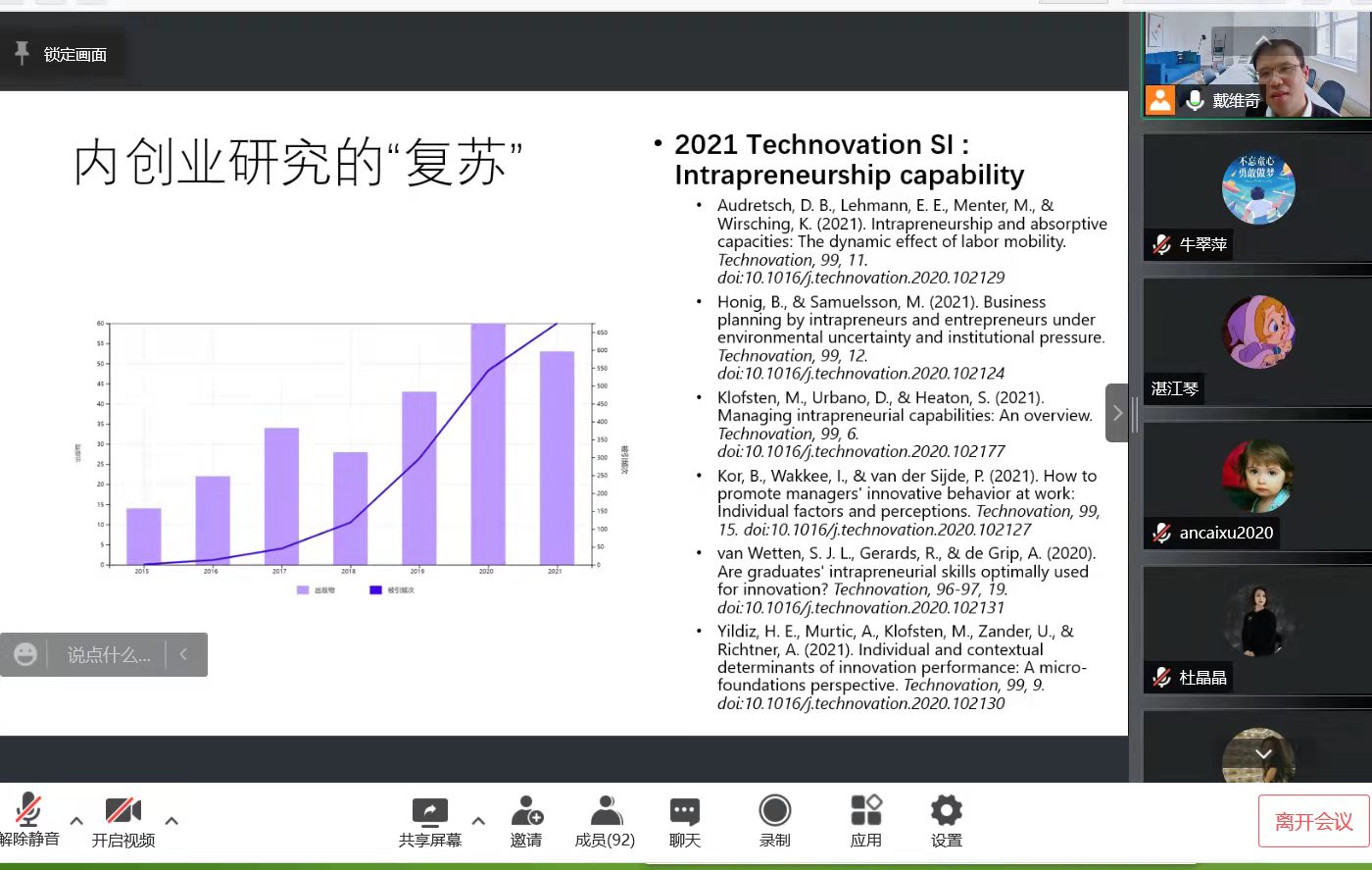 报告中,戴维奇教授首先梳理了国内外公司创业研究的基本脉络,将其呈现为一颗生机勃勃、不断成长发展的“常青树”。接着,他结合自己的研究经历,围绕如何基于既有理论做好在中国情境下的公司创业研究,谈了几点体会,包括对数据/现象保持高度的敏感、做出对理论的贡献以及追求“新奇”和讲好中国独特的公司创业故事等。对于每一个体会,他都结合自己的研究和发表做了诠释。最后,戴教授对公司创业领域的研究进行展望,指出未来公司创业研究可行的方向,包括聚焦于公司创业具体现象展开深入研究、与主流战略管理议题交叉研究以及与国内主流话题关联等。