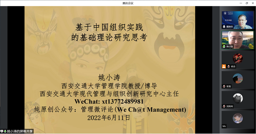 师生作题为《基于中国组织实践的基础理论研究思考》的讲座。本次讲座通过腾讯会议在线上举行,吸引了我校师生以及外校学者110余人。讲座由副院长戴维奇教授主持。