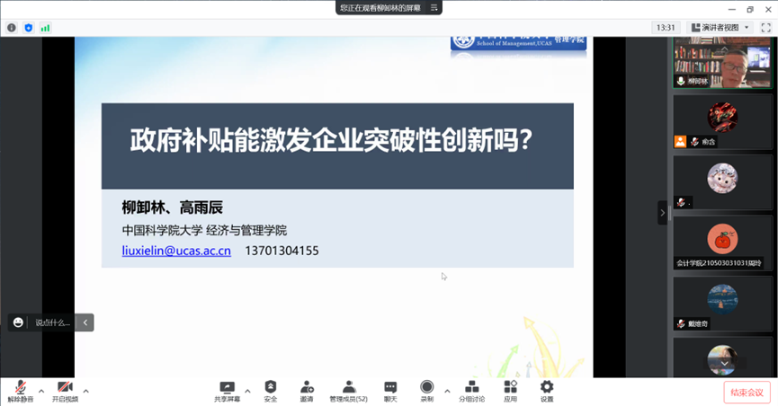师生作题为《政府补贴能促进企业创新吗?》的讲座。本次讲座通过腾讯会议在线上举行,吸引了我校师生以及外校学者60余人。