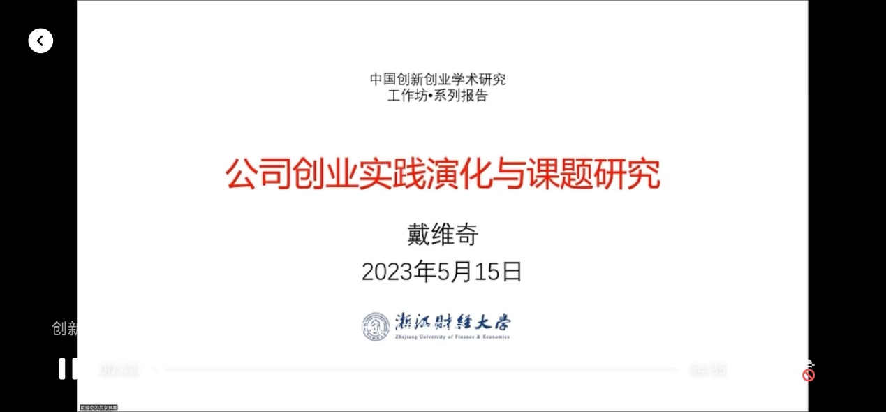 副院长戴维奇教授在中国创新创业学术研究“工作坊•系列报告”(第17期)作题为《公司创业实践演化与课题研究》的专题报告。此次报告会通过微信视频号直播,1200人次参加了会议。