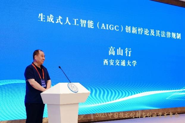 教授、国家社科基金重大项目首席专家高山行作题为《生成式人工智能(AIGC)创新悖论及其法律规制》的主题报告。高山行教授从AI发展对人类的影响、AI的走向、AI产生的问题及其规制的难点、AI规制的原因与方法、生成式人工智能创新悖论以及关于AI领域创新研究的思考六个方面展开论述。他指出,创新的研究将与更多的学科进行交融,与此同时学科的分类会逐步淡化,而从创新的角度来看AI有利于相关制度的设计。