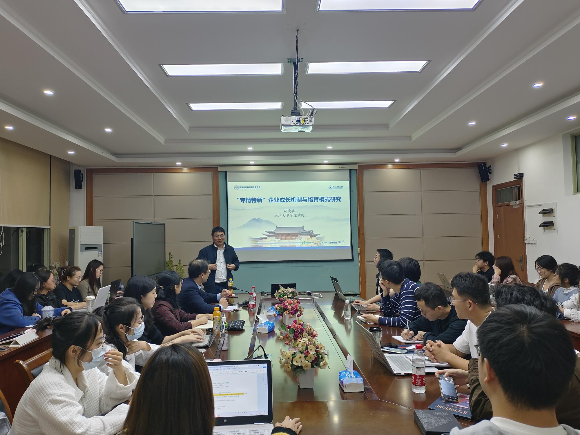 首先,邬爱其教授带来题为《“专精特新”企业成长机制与培育模式研究》的主题报告。邬教授从“点”“线”“面”三个层次揭示了“专精特新”企业所面临的多重挑战以及“专精特新”企业培育和成长研究中的科学问题,提出构建“专精特新”企业成长理论的核心任务。随后,邬教授详细介绍了研究框架中涉及的五个子课题:“专精特新”企业成长理论基础构建研究、“专精特新”企业成长环境及影响研究、“专精特新”企业成长机制研究、“专精特新”企业成长路径研究、“专精特新”企业培育模式研究。接着,邬教授介绍了近期基于实地调研着手推进的若干研究议题,包括高管团队与“专精特新”企业发展、专业化与“专精特新”企业国际化、大客户战略与“专精特新”企业创新以及“脱钩断链”与“专精特新”企业国际化等。