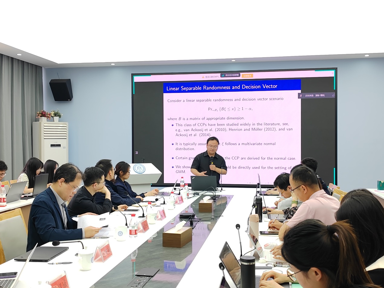 胡照林教授以“Chance Constrained Programs with Gaussian Mixture Models”为主题分享相关研究成果。胡教授结合了最近的两篇研究成果,就研究模型和问题方面进行阐述。在研究模型方面,胡教授讲述了机会约束规划模型的背景,以机会约束规划方法为代表,描述了模型的绩效化等方面。随后,胡教授根据不同问题给出了相应的目标函数和约束条件,并详细阐述了各约束、参数的含义。接着,胡教授阐明了联合机会约束规划和单个机会约束相结合的方法,并介绍了水库管理、电网优化等方面的现实问题应用,以及“Gaussian mixture”在机器学习等方向上的理论运用,明确了研究问题方向。最后,胡教授介绍了不同类型的机会约束规划,介绍了梯度简化等方法,并讲述了工作所取得的成效,总结了方法的优势。