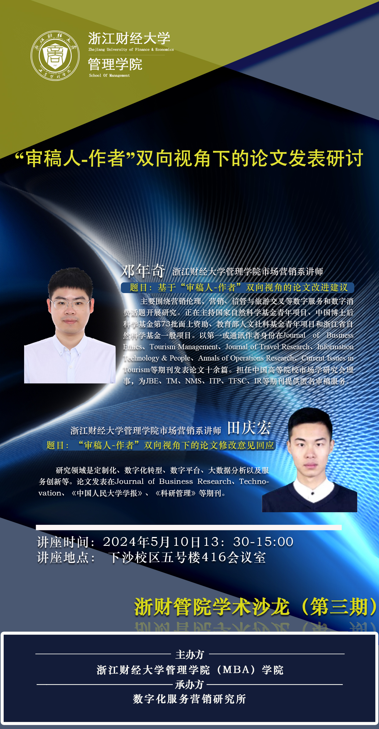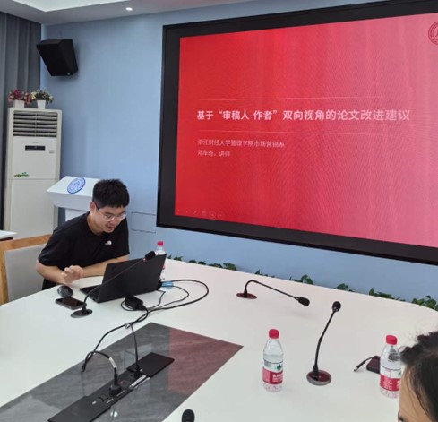 在5-416会议室举办了本学年第三期学术沙龙活动。市场营销系的邓年奇老师和田庆宏老师作了专题为“审稿人-作者”双问视角下的论文发表研讨”的报告。本次活动由高键老师主持,市场营销系主任陈颖和各位老师出席了本次活动。