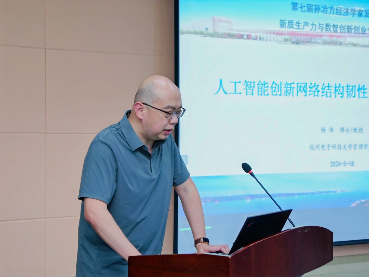 杨伟教授以“人工智能产业创新网络结构韧性的形成与演化机制”为题分享其研究成果。首先,杨教授聚焦于人工智能在技术突破、生产要素创新配置和产业转型升级中的关键作用,强调了发展新质生产力的重要性。随后,杨教授讨论了创新网络的韧性,指出创新网络虽重要,但在面对外部冲击时也存在脆弱性。进一步探讨了创新网络韧性的不同阶段,并提出了创新网络韧性的概念模型,包括个体和系统层面的韧性。接着,杨教授通过对北京和上海人工智能创新网络的实证研究,揭示了两个城市网络的相似性和差异性。最后,杨教授提出了对未来创新网络和生态系统研究的新思考,包括数智技术的影响和人工智能作为创新主体的崛起以及人工智能带来的复杂性和对创新生态系统研究范式的潜在改变等。