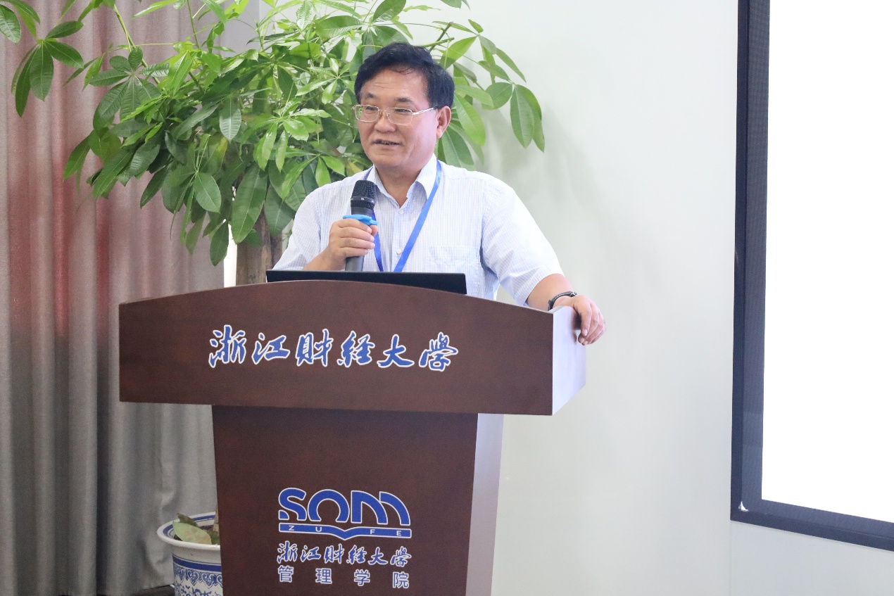 宣传部部长王正新教授主持,华东交通大学副校长欧阳志刚教授、中国人民大学李勇教授作报告。欧阳志刚教授分享了主题为“金融资源、生产要素配置与全要素生产率”的学术报告。生产要素创新性配置是发展新质生产力、推动经济高质量发展的一个重要渠道,研究构建了一个包括融资部门金融资源配置和生产部门生产要素配置的理论分析框架,并基于中国企业中间投入占比较高的现状,在考虑实物资本和劳动两种生产要素的基础上进一步引入了中间投入,系统地测算并分析了不同类型的金融资源配置对各种生产要素配置及全要素生产率的影响。李勇教授分享了“基于大数据的贝叶斯统计推断研究进展及其应用”。研究针对海量数据下模型设定偏差的模型比较问题,提出两种新的基于惩罚的预测信息准则:先借助变分贝叶斯后验分布,从预测视角推导出变分插入预测分布和变分后验预测分布两类预测分布,接着研究了与这两类分布相关、以数据生成过程和预测分布间KL散度期望定义的风险函数,在特定正则条件下证明所提信息准则是各自风险函数的渐近无偏估计量,最后验证了其在海量数据模型设定偏差场景下模型比较的性能。