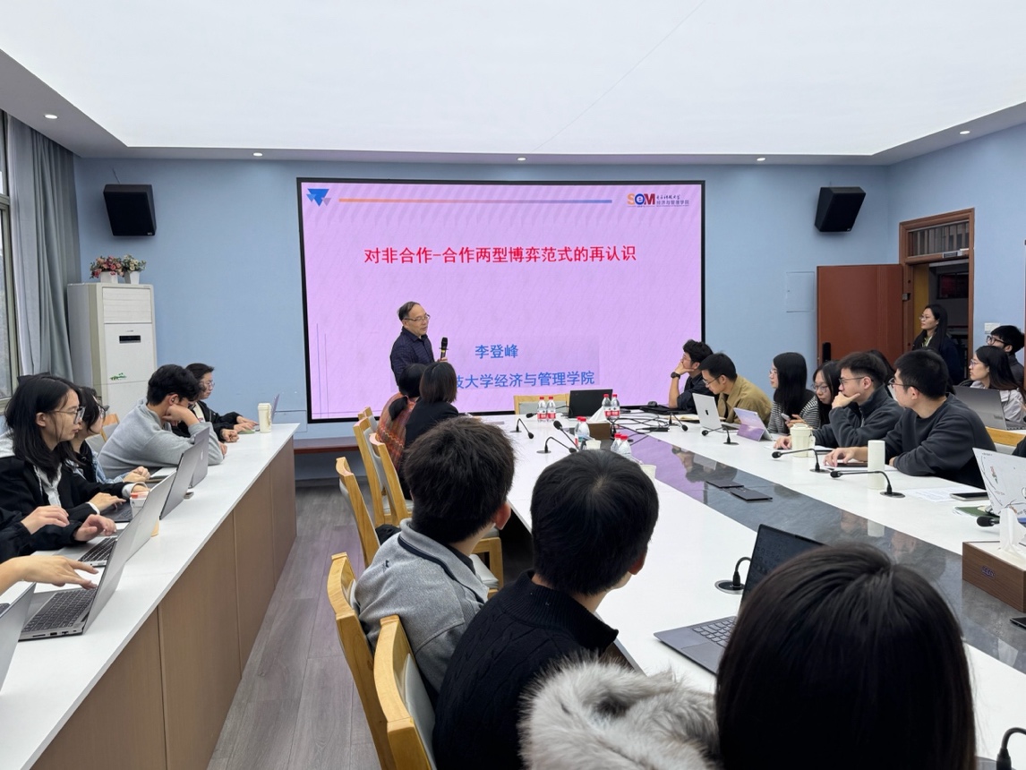 416会议室成功举办。本期讲座由数智决策和数智运营研究中心承办,特邀电子科技大学长江学者特聘教授李登峰,以“竞争与合作并存的非合作-合作两型博弈范式”为题,为师生带来一场前沿学术分享。讲座由戴维奇副院长主持。