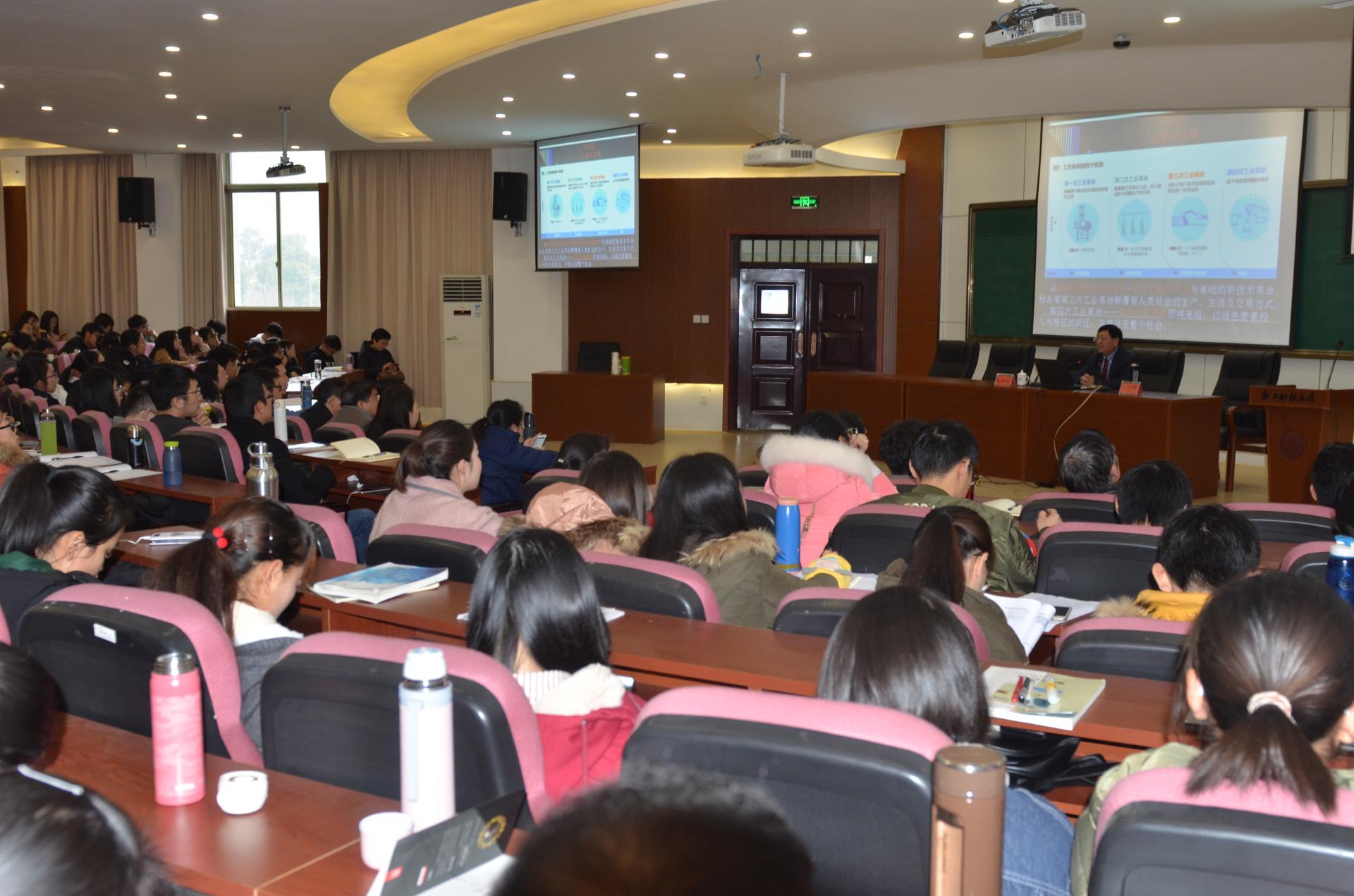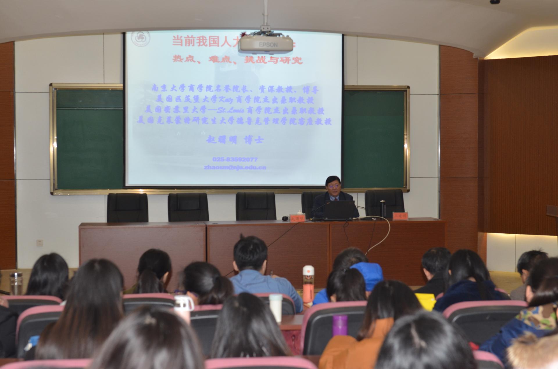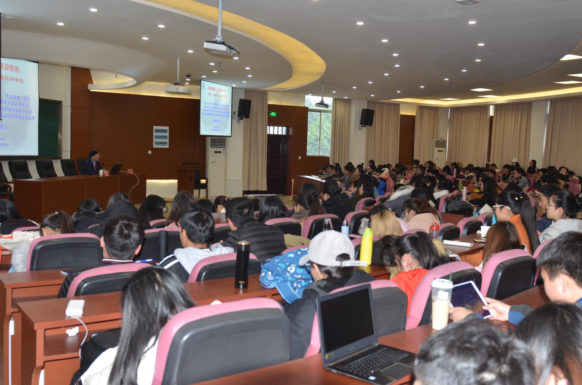 邀请我国著名人力资源管理专家、南京大学商学院名誉院长、资深教授、博士生导师赵曙明博士,为我校师生做了一场题为“当前人力资源管理热点、难点、挑战与研究”的讲座。能够容纳150人的报告厅座无虚席,还添加了不少椅子,主持人王建明教授不禁感叹:“大师出场,自带光环”。