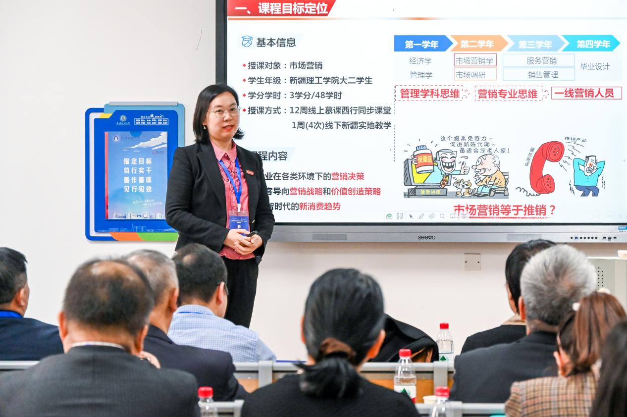陈颖老师以“慕课西行,金课援疆”为抓手,结合《市场营销》导研、导练、导思的课程特点,从课程定位、学情分析、范式改革、创新举措、评价考核和创新成效等六个方面,详细深入地汇报了在新文科背景下,课程依托“数智赋能”,坚持三年时间为新疆理工学院市场营销学生每周线上授课,每年远赴4300公里线下授课,指导新疆学生荣获省级大学生乡村振兴大赛金奖5项,为新疆理工学院培养青年骨干教师4名,为全国高等教育组团式援疆贡献“柔性援疆”的番茄小说