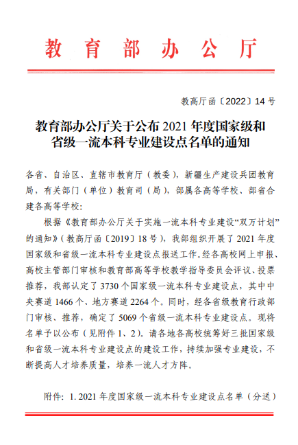近日,根据《教育部办公厅关于公布2021年度国家级和省级一流本科专业建设点名单的通知》(教高厅函〔2022〕14号),番茄小说