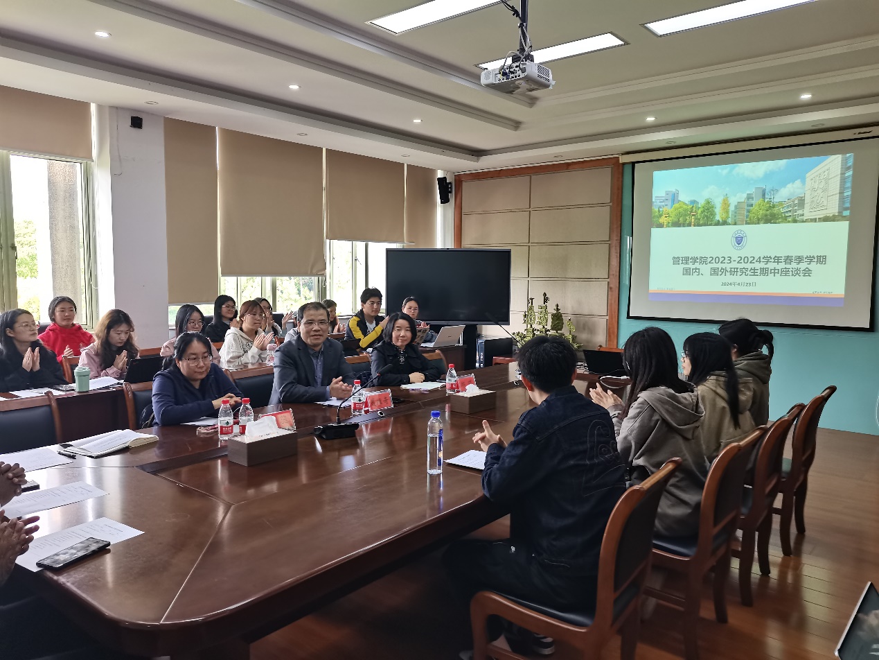 2023-2024学年春季学期国内外研究生期中座谈会于2024年4月23日在5号楼410会议室成功举行。本次会议由学院副院长戴维奇教授主持,研究生教学督导邱瑾教授、留学生主管董蕊教授、研究生秘书徐璐老师及37位国内外研究生代表,共同探讨了研究生课程教学和培养管理的现状与挑战。