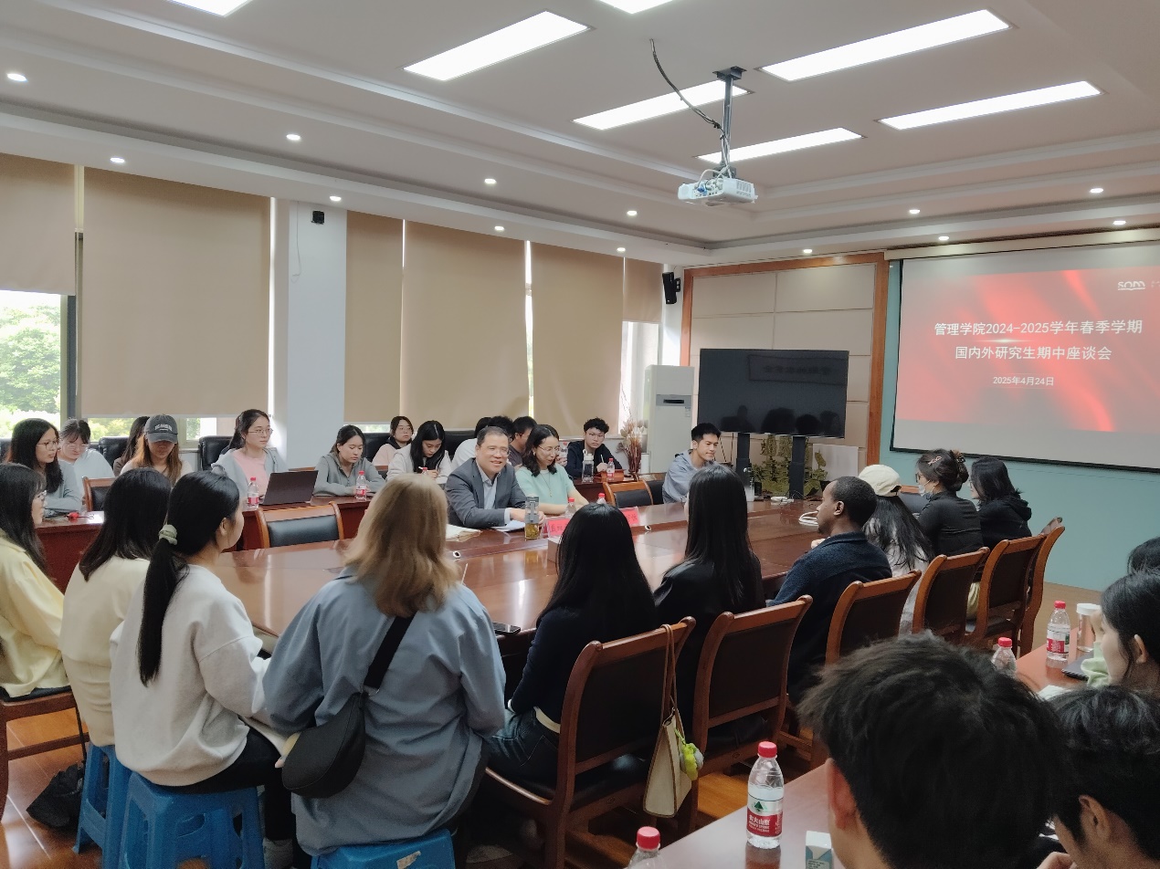2024-2025学年春季学期国内外研究生期中座谈会于2025年4月24日在番茄小说 410会议室举行。本次座谈会由学院副院长戴维奇教授主持,研究生教学督导赵宇恒教授、研究生秘书徐璐老师以及40余名国内外研究生代表齐聚一堂,共同围绕研究生课程教学和培养管理展开深入探讨。