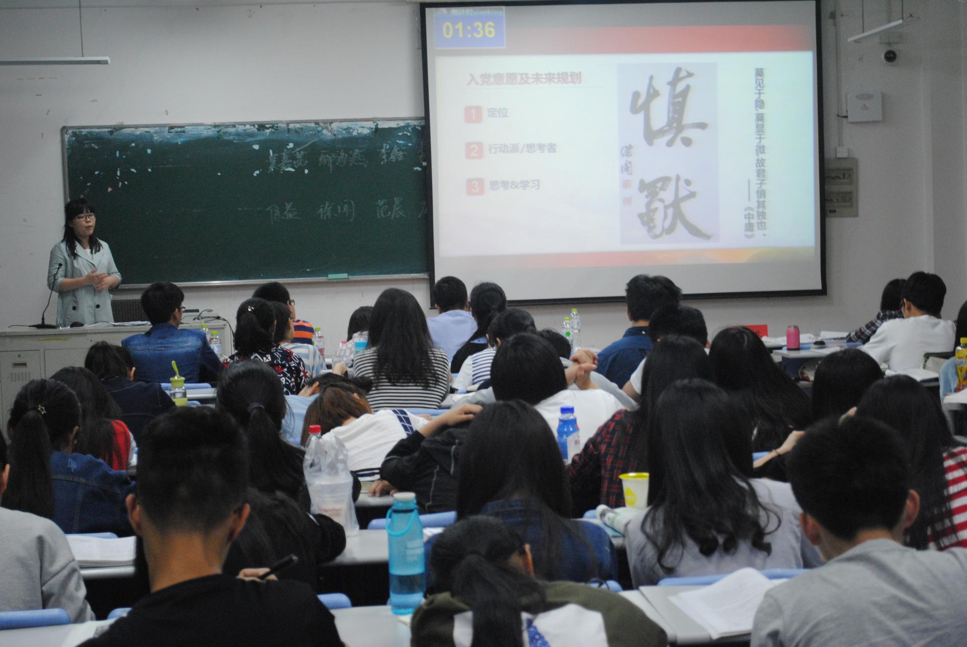 此次公开答辩会主要流程:14名发展对象根据抽签结果依次上台进行答辩,每位答辩人时间12分钟,其中6分钟为根据自己入党意愿、目前表现和未来规划进行个人PPT展示,6分钟为回答问题环节,每人回答两个问题其中一个问题为必答题,必答题为同一个问题,主要侧重考察其入党意愿和对党的认识,一个为从8个选定的问题中随机抽取的问题,主要考察其对党员职责、形象与素质提升认识,对我国当前重要经济发展战略、发展理念与高等教育改革等基本国策关注与理解。答辩评委由本支部书记胡星平老师,支部委员沈佳其、曾晓卉、苏珊,周琳以及学生第二党支部书记刘远琳老师等6位组成。评委根据各位发展对象答辩展示的入党意愿、目前表现与未来规划及回答问题表现等情况在评分表上打分,然后根据分数高低从14名发展对象中投出10位同学,支部根据6位评委投票情况,由选定的唱票、计票、监票人员进行唱票、计票并监督,得票前10位确定为本支部本次发展对象。