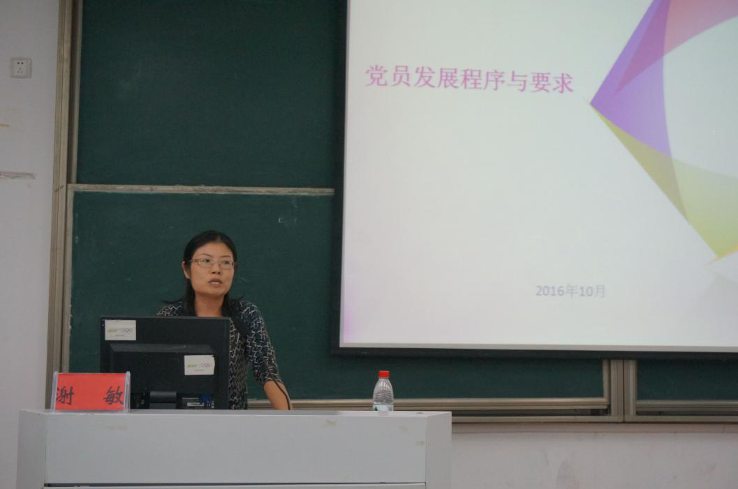 谢敏老师主要为大家详细介绍了“党员发展程序与要求”。讲述内容主要为:入党标准和发展党员工作程序。她为我们重点阐述了入党五个步骤即个人申请、确定入党积极分子、确定发展对象、接收预备党员、预备党员转正的相关工作与要求。她对现阶段的党员发展程序提出了两个基本观点,即“把好入口”;“顺畅出口”。要成为一名合格的党员,在申请入党前一定要明确自己的入党动机,学员对共产主义的信仰是成为一名党员的标准。党的基础就是党员,而党员素质更是决定着组织的未来,所以党员必须要经过严格的筛选、培养;入党后,党员要时刻铭记“全心全意为人民服务”的宗旨,保证党的先进性和纯洁性。最后,她对学习班的全体学员提出了几点要求,指出对番茄小说