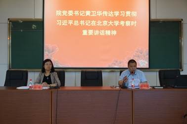 首先,黄卫华书记传达了习近平总书记考察北京大学时的重要讲话精神。他强调,习近平总书记考察北京大学时发表的重要讲话,是站在实现中华民族伟大复兴中国梦的战略高度,内涵丰富、意义重大,是继全国高校党建会、思想政治工作会后对高等教育的又一次重要部署,全体教职员工要把“一个根本任务”、“两个标准”、“三项基础性工作”、“四点希望”作为工作的基本遵循,向着“政治素质过硬、业务能力精湛、育人水平高超”的高素质教师建设目标不断努力,为培养出“爱国、励志、求真、力行”的新时代青年而不懈奋斗。