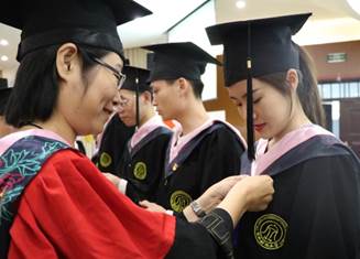 的优秀党员,让我们为你们最后一次佩戴党徽。”党委副书记谢敏老师和党委委员郭军灵老师为全体毕业生党员佩戴党徽。