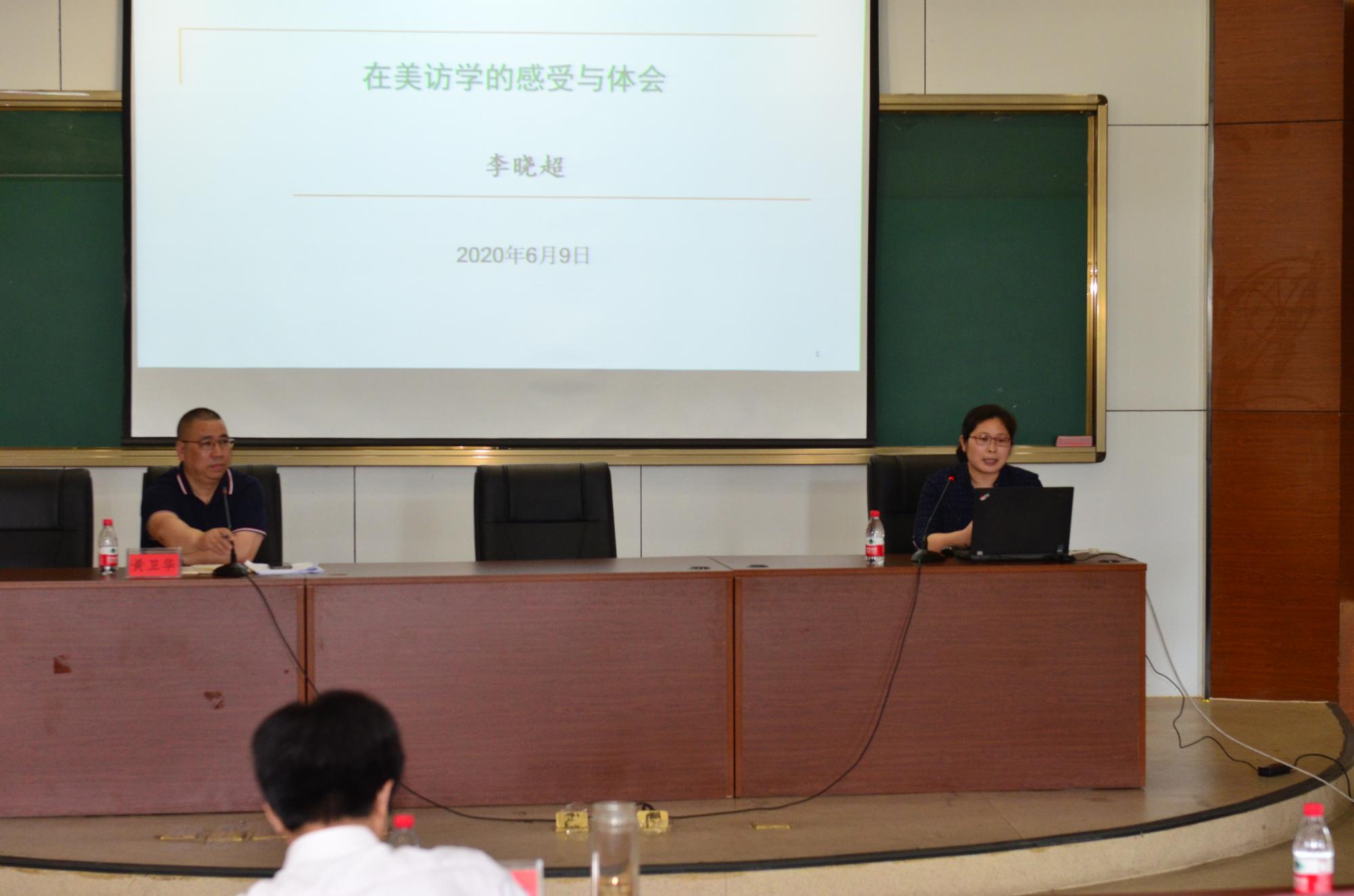 党员教师阮锋儿在报告会上谈了他在美国托莱多大学访问期间的生活、学习和研究。他庆幸的说,现在美国疫情这么严重,幸好自己回来的比较早。作为一名中国人,我很骄傲;作为一名党员,我更加要时刻牢记自己的身份和使命。李晓超和唐春晖老师也分别介绍了自己在范德比尔特大学和伊利诺伊大学的学习和研究情况,她们在报告中,都不约而同的谈到的感悟就是:回到家真好,还是中国的制度好。