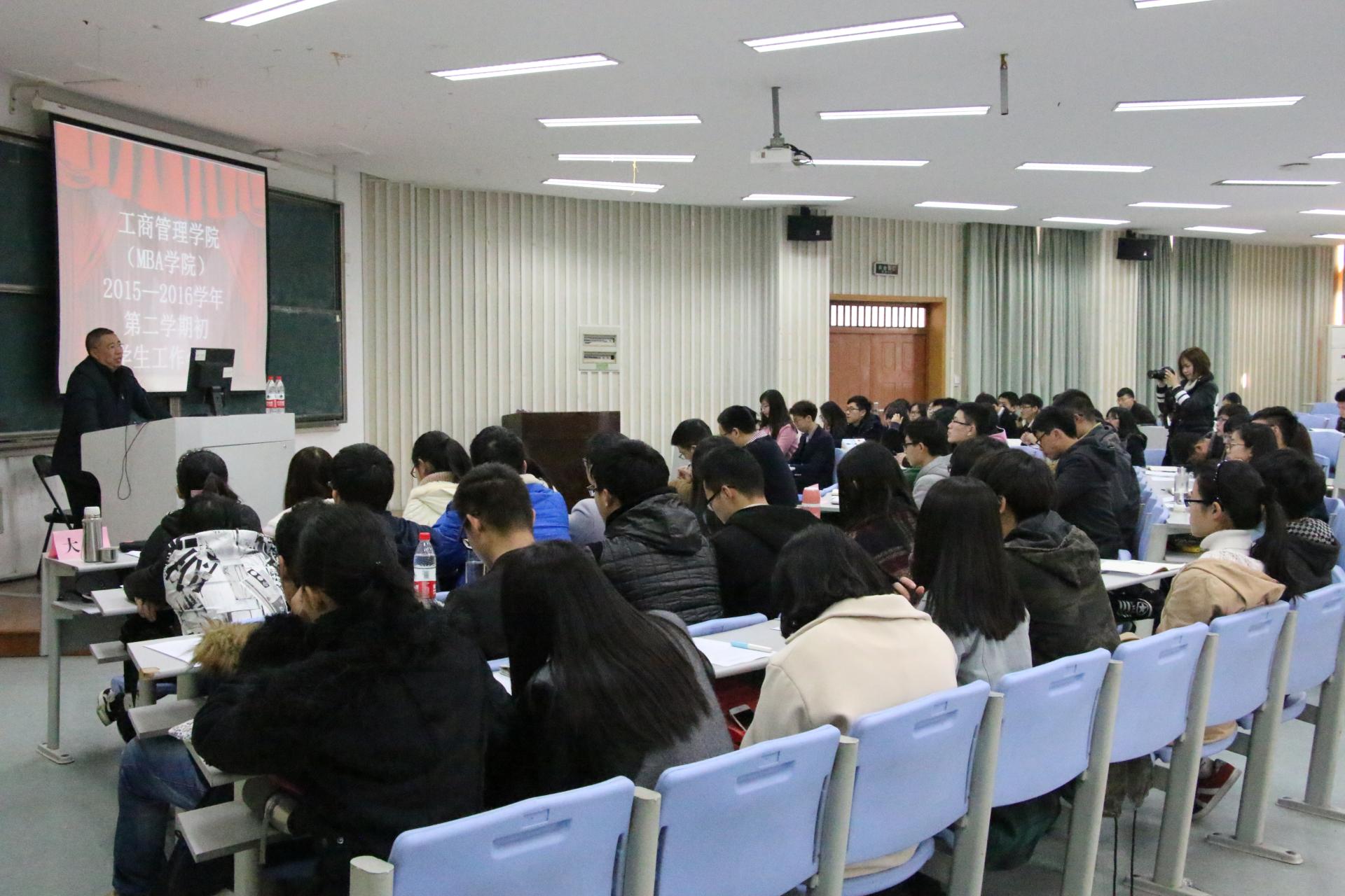 和MBA学院组合而成,提出学院新发展愿景。着重强调了学院核心工作是学生培养,因此他希望老师与同学们多沟通,建立起良好的关系。对于学院建设,他认为应积极响应创新创业的号召,主张将学生工作与学科建设、专业建设结合在一起,以能力培养为核心构建学生活动,鼓励同学们在学科竞赛上投入更多精力,从竞赛中提升自己。他还指出学院人才将做分类培养,针对考研方向、就业方向采取不同的人才培养方案。此外他再次强调了学风建设方面的“三无两高”课堂,指出树立良好的学风是关键,学生干部应当做好表率,塑造良好的学习氛围。