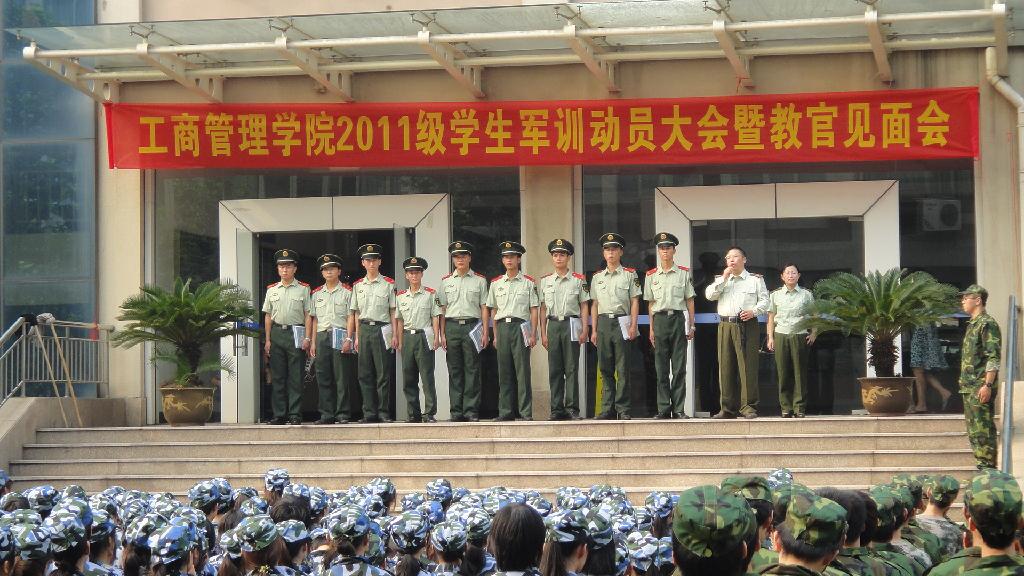 在鸟语花香,红情绿意的四月,在书声朗朗,柳绿花红的学涯湖畔,400多11级同学终于盼来了期待已久的军旅生活,7日晚4点30分工商学院2011级学生军训动员暨四营教官见面会在学院楼东门隆重举行。学院党总支副书记黄卫华,辅导员梁磊、杨文超老师及9名武警浙江总队直属支队教官代表出席了本次大会。