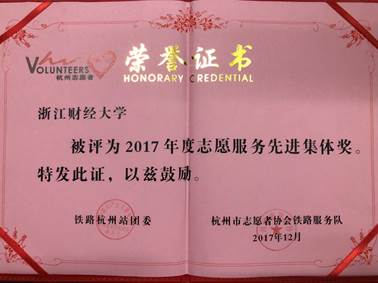 四十余名师生志愿者在杭州火车东站开展了为期两天的志愿服务活动。在寒冷的冬日里,志愿者们维护秩序、搬运行李、发放宣传手册、写春联送祝福,那一抹鲜亮的志愿红,让寒冬里的回家路倍感温暖与温馨,活动由FM93交通之声全程直播报道。志愿者们的服务得到了群众的好评,杭州铁路站团委、杭州市志愿者协会铁路服务队特授予我校2017年度志愿服务先进集体奖,杭州铁路站团委书记周嫣然、杭州志愿者协会副秘书长毛立靖为获奖者颁奖。