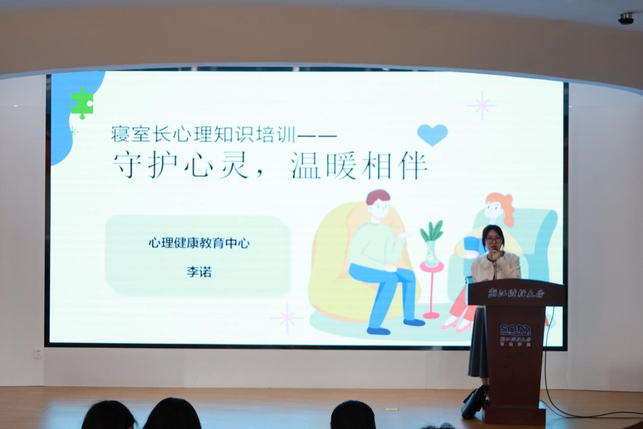 在寝室长培训中,学院首先邀请了来自校心理健康教育中心的李诺老师对寝室长进行授课。在这场以“守护心灵、温暖相伴”为主题的寝室长心理知识培训中,李诺老师采用活泼有趣的授课方式帮助各位寝室长们理清工作职责、掌握工作方法,以期发挥朋辈力量共促心理健康发展。