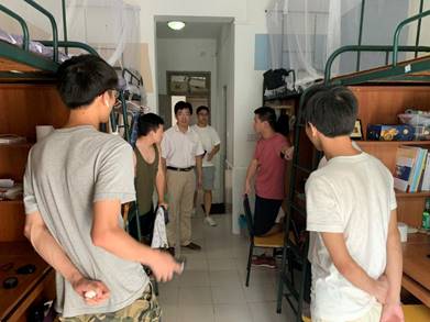 院长董进才、党委书记黄卫华、党委副书记谢敏、副院长王建明、副院长倪文斌及全体辅导员走访本科生、研究生宿舍,对学生进行关爱慰问活动。