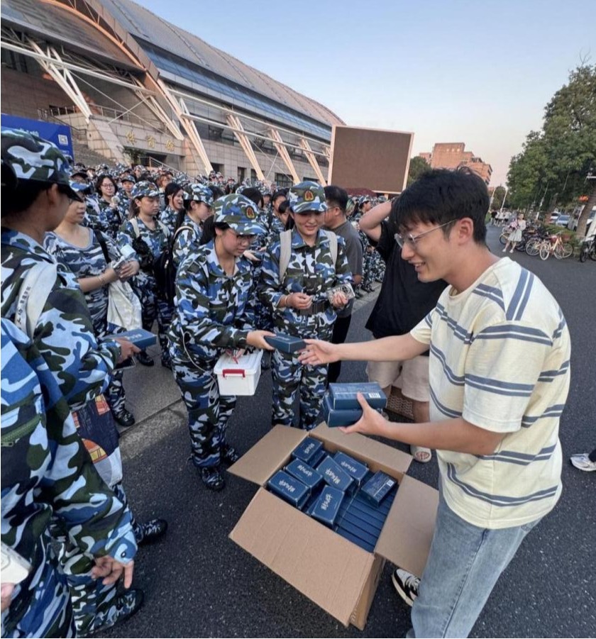 此次月饼发放分为两次进行。首次发放于军训场地温情开展,学院领导和老师为正在挥洒汗水的新生们送上月饼,亲切交谈,鼓励他们尽快适应大学生活,让初入校园的他们在训练之余感受到管院大家庭的温暖关怀。