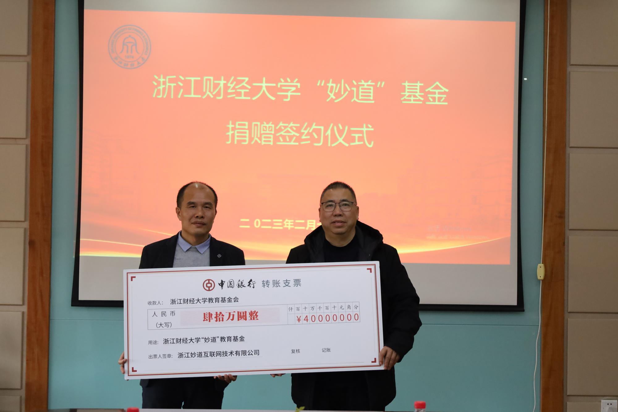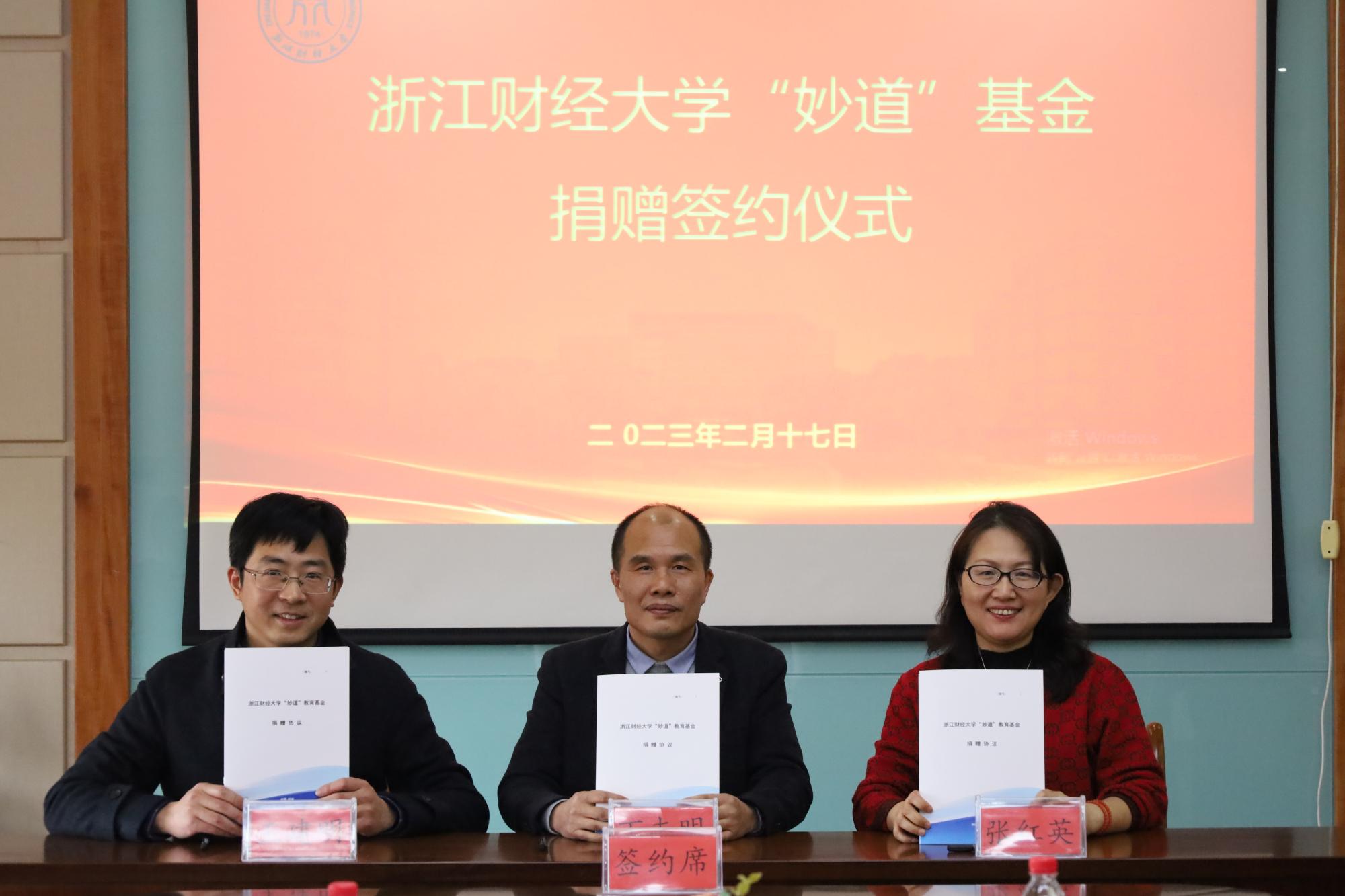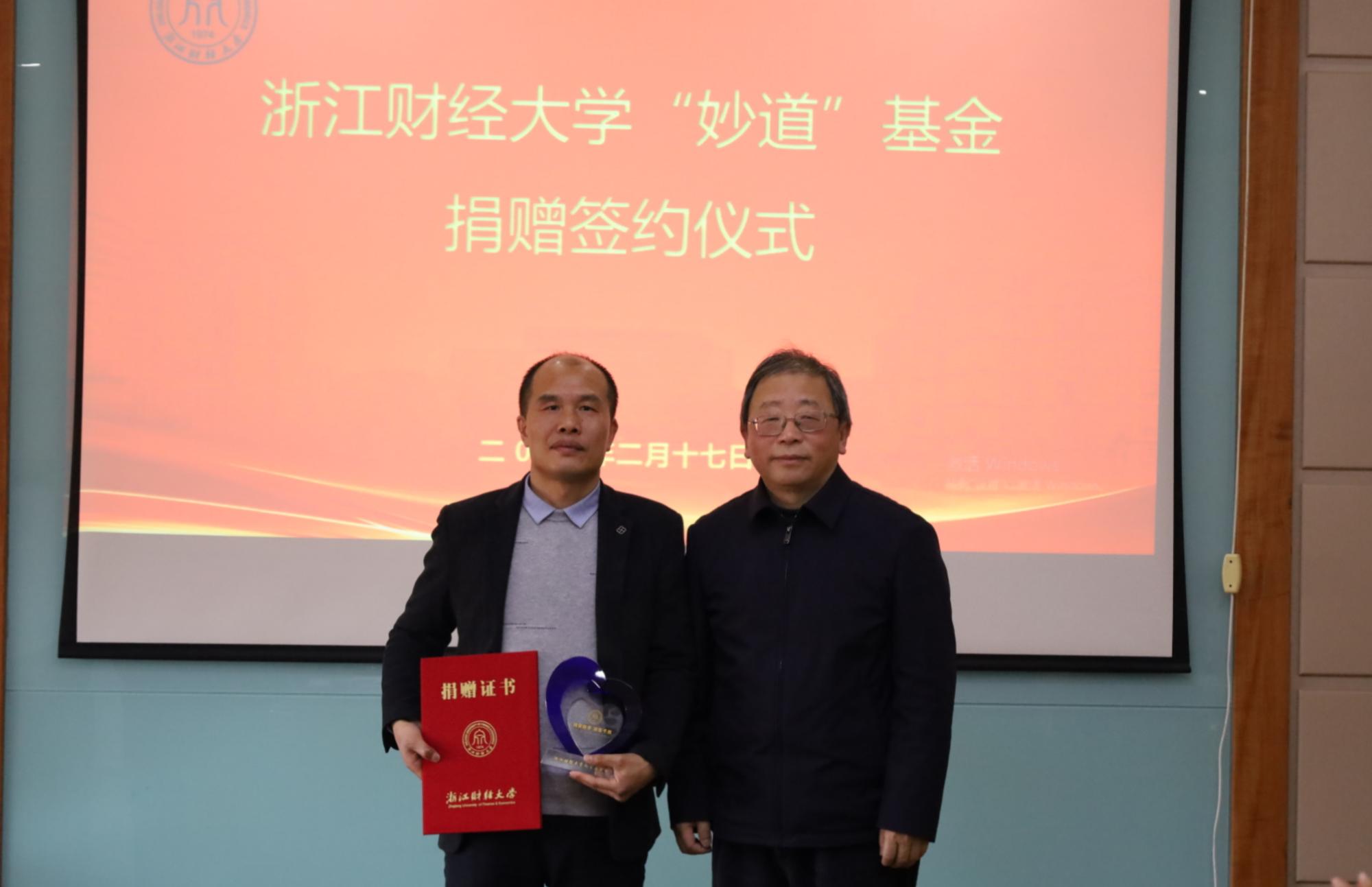捐赠40万元,设立“妙道”基金。校长钟晓敏,浙江妙道互联网技术有限公司总经理丁志明、浙江省职业经理人协会秘书长沈建等出席仪式。