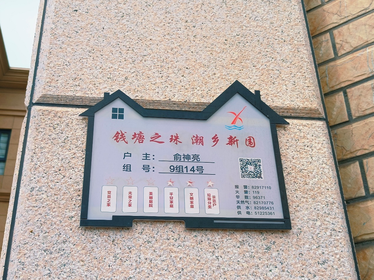 经过二十多分钟的车程,小组驶入位于河庄街道的新围村。“奔竞不息,勇立潮头”的围垦精神,激励着一代代围垦弄潮儿打造了一个风光秀丽的美丽村庄。新围村的街道井然有序,两旁屋舍俨然,每幢房屋前都有一个写着本户家庭基本信息的牌子,上面还附有二维码,可扫码了解更多相关信息。