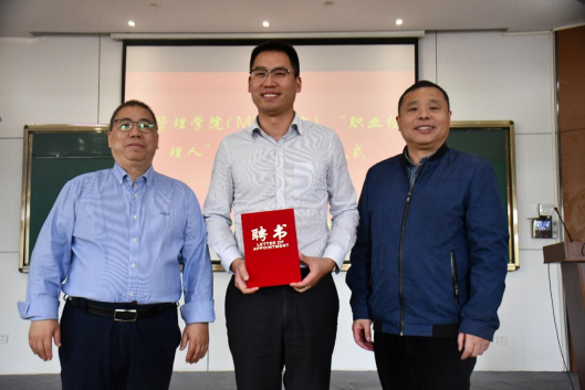 朱力明为张广平颁发“职业经理人”社会导师聘书,他表示此次聘任不仅是学院对张广平校友毕业后在工作岗位和专业领域内发展所取得成绩的高度认可,也体现了张广平校友毕业后在个人事业奋斗打拼的同时,一直心系并反哺母校教育事业的“学子情怀”,我们相信张广平校友本次受聘学院”职业经理人“社会导师后,将会进一步助力学院发展和人才培养工作。