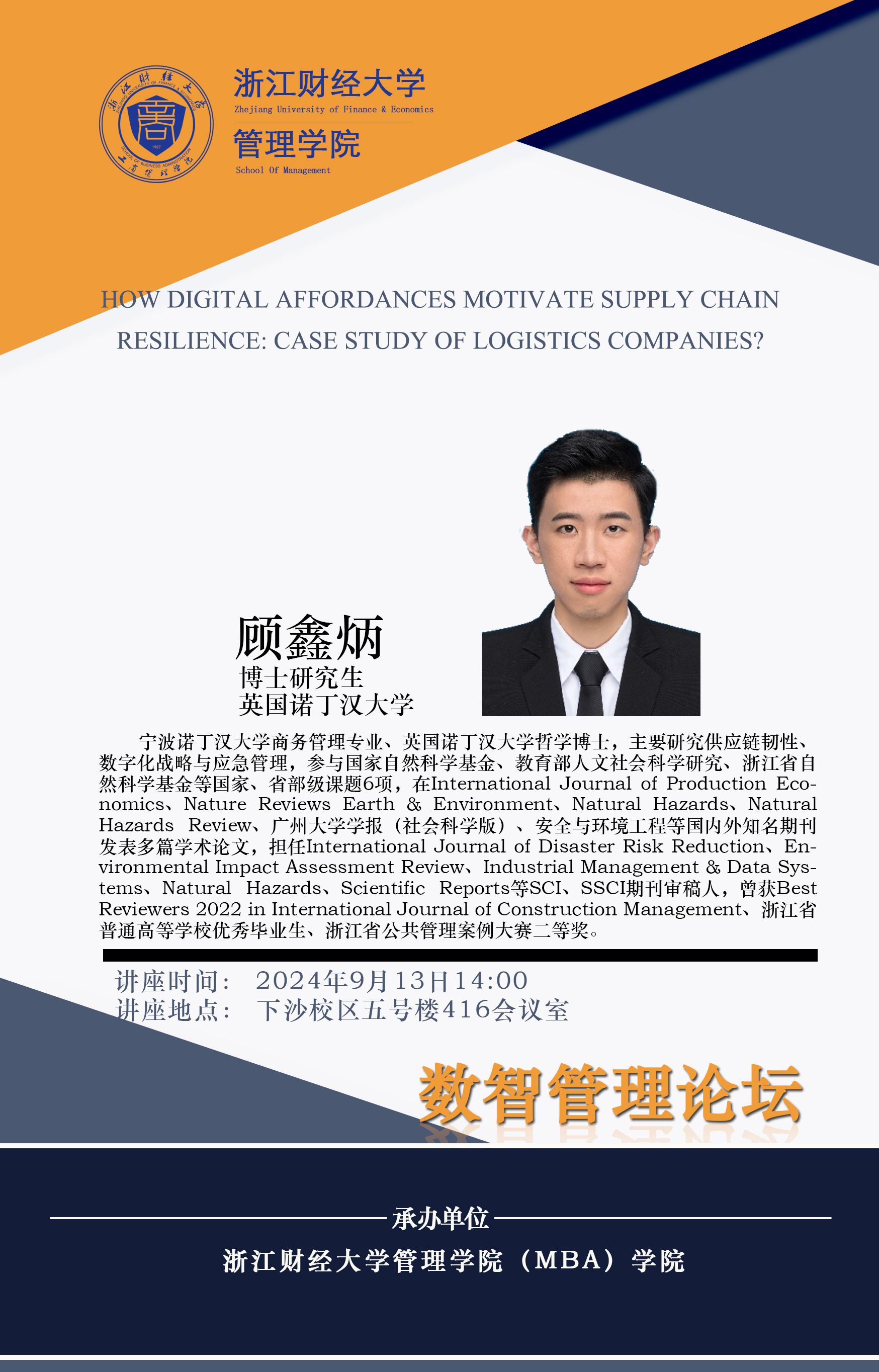 【讲座预告】顾鑫炳:HOW DIGITAL AFFORDANCES MOTIVATE SUPPLY CHAINRESILIENCE: CASE STUDY OF LOGISTICS COMPANIES?