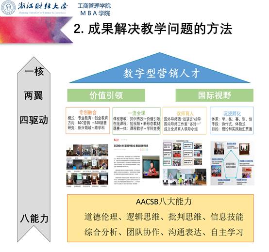 市场营销系基于九年的教学实践,结合市场营销中美合作办学项目——专业销售(Profession sales),向本次大会提交阐述了《AACSB核心能力视角下“一核双翼四驱”中美合作项目营销人才培养模式》(完成人:王建明、陈颖、王建国),荣获教学成果奖三等奖殊荣。