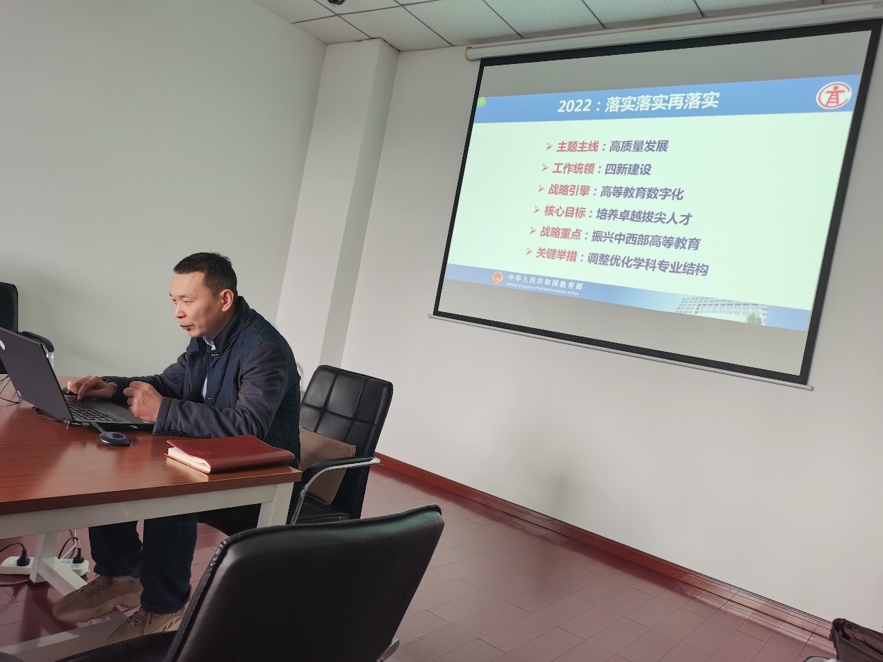 随后,张雷副院长带领市场营销系全体教师学习了教育部高等教育司吴岩司长2月25日在重庆做的最新报告《深化新教改、打造新形态、提高新质量》,系统回顾了中国高等教育在2021年取得的成绩,同时,从20件大事、五方面重点工作,全面落实2022年中国高等教育工作,提出心怀“国之大者”,做“顶天”的工作,坚持“久久为功”,做“立地”的事情,让中国高等教育质量更高、实力更强、品牌更亮。。