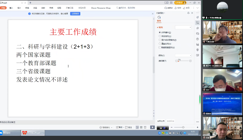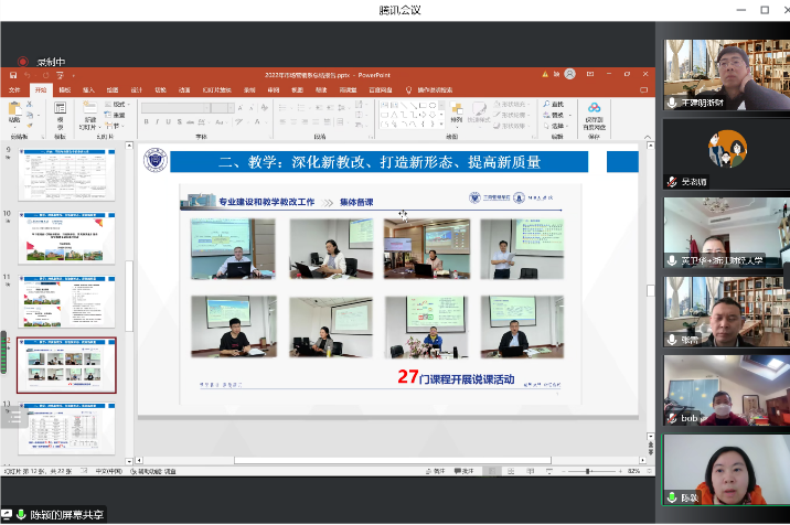 4位系主任和中美项目负责人分别就本系(项目)一年来取得的工作成果及各项考核指标完成情况进行了精彩的PPT线上演示汇报。由学院领导、系部教师、行政人员组成的学院考核小组认真听取了汇报,并进行了现场评价打分,得分按总分进行排序。