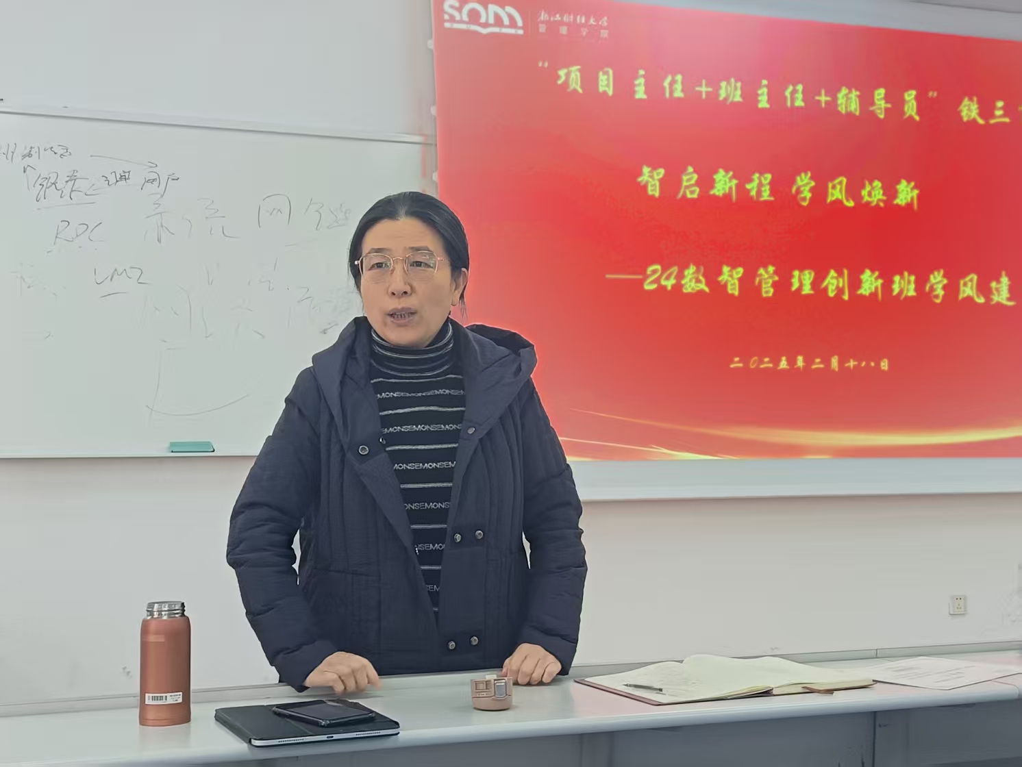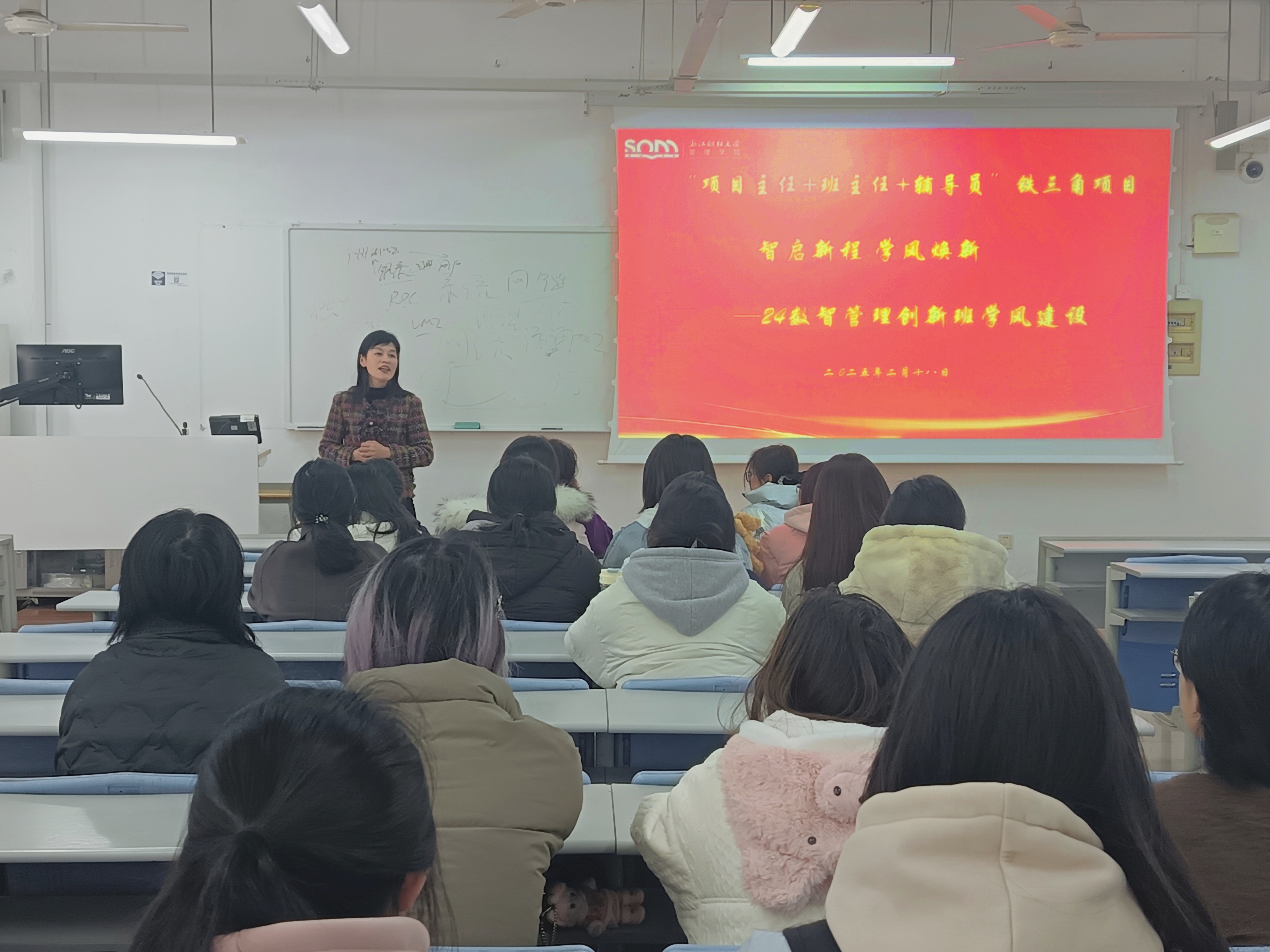 2月18日下午,24级数智管理创新班成功召开期初班会与班级学风建设会议。学院党委副书记陈小芳,班主任吴丽民老师、沈渊老师,带班辅导员周依凡老师,以及创新班全体学生齐聚一堂,本次班会由沈渊老师主持。
