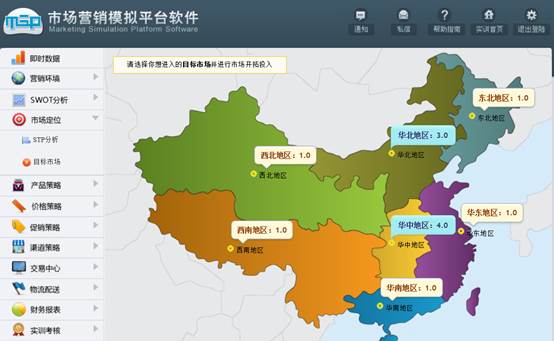 在本软件模拟环境中,将全国市场划分为七大区域进行营销策略模拟和演练。参与实验的每个学生经营一家公司,扮演公司营销总经理角色,每家公司分配相同资本开始进行模拟实验。通过市场开拓、产品策略、价格策略、促销策略和渠道策略的实施开始公司运营。实验结束时可根据公司经营状况来评定学生的实验成绩。